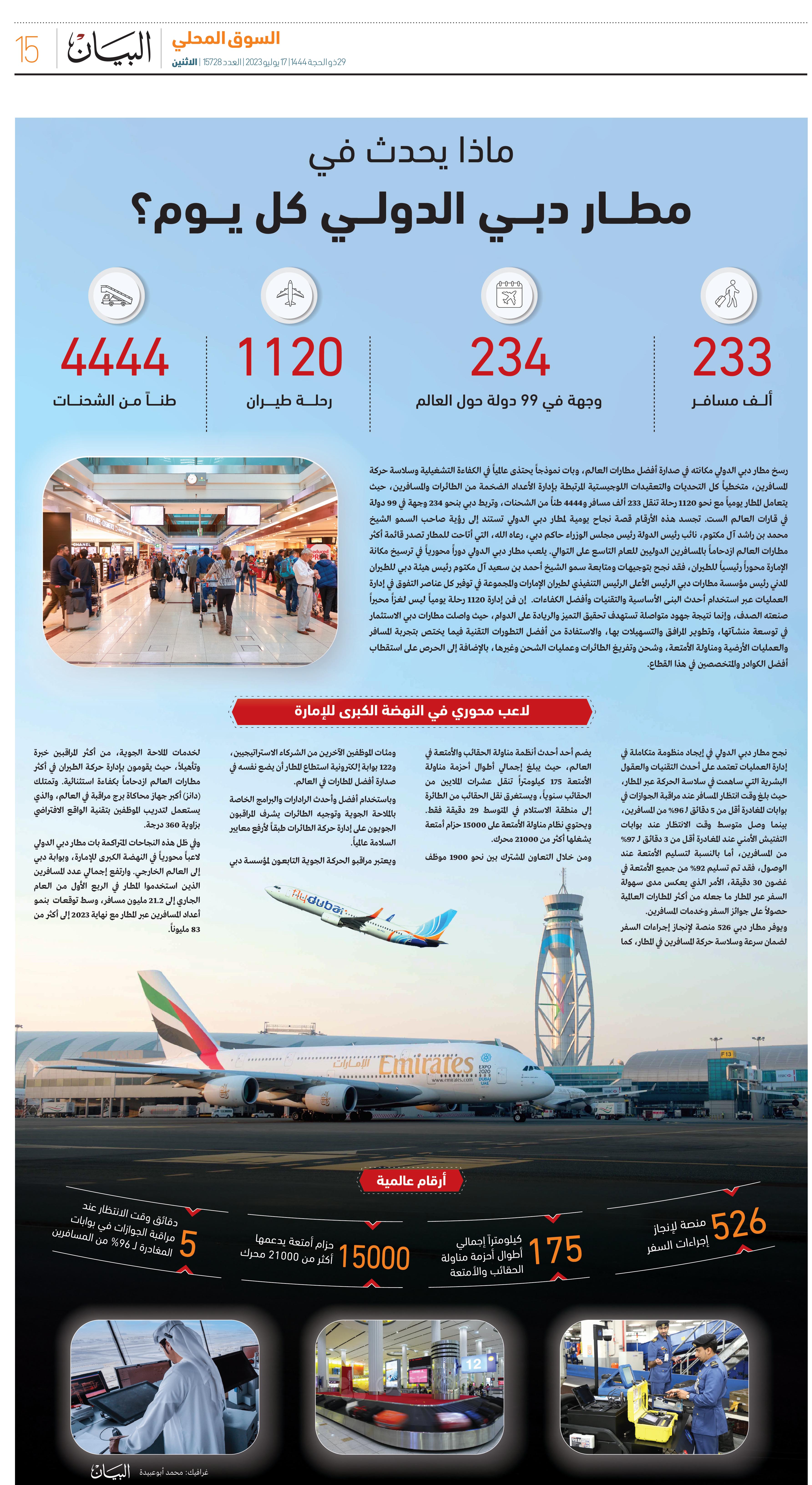 رسخ مطار دبي الدولي مكانته في صدارة أفضل مطارات العالم، وبات نموذجاً يحتذى على مستوى العالم في الكفاءة التشغيلية وسلاسة حركة المسافرين، على الرغم من التحديات والتعقيدات اللوجيستية المرتبطة بإدارة الأعداد الضخمة من الطائرات والمسافرين، حيث يتعامل المطار يومياً مع نحو 1120 رحلة تنقل 233 ألف مسافر و4444 طناً من الشحنات، وتربط دبي بنحو 234 وجهة في 99 دولة في قارات العالم الست.