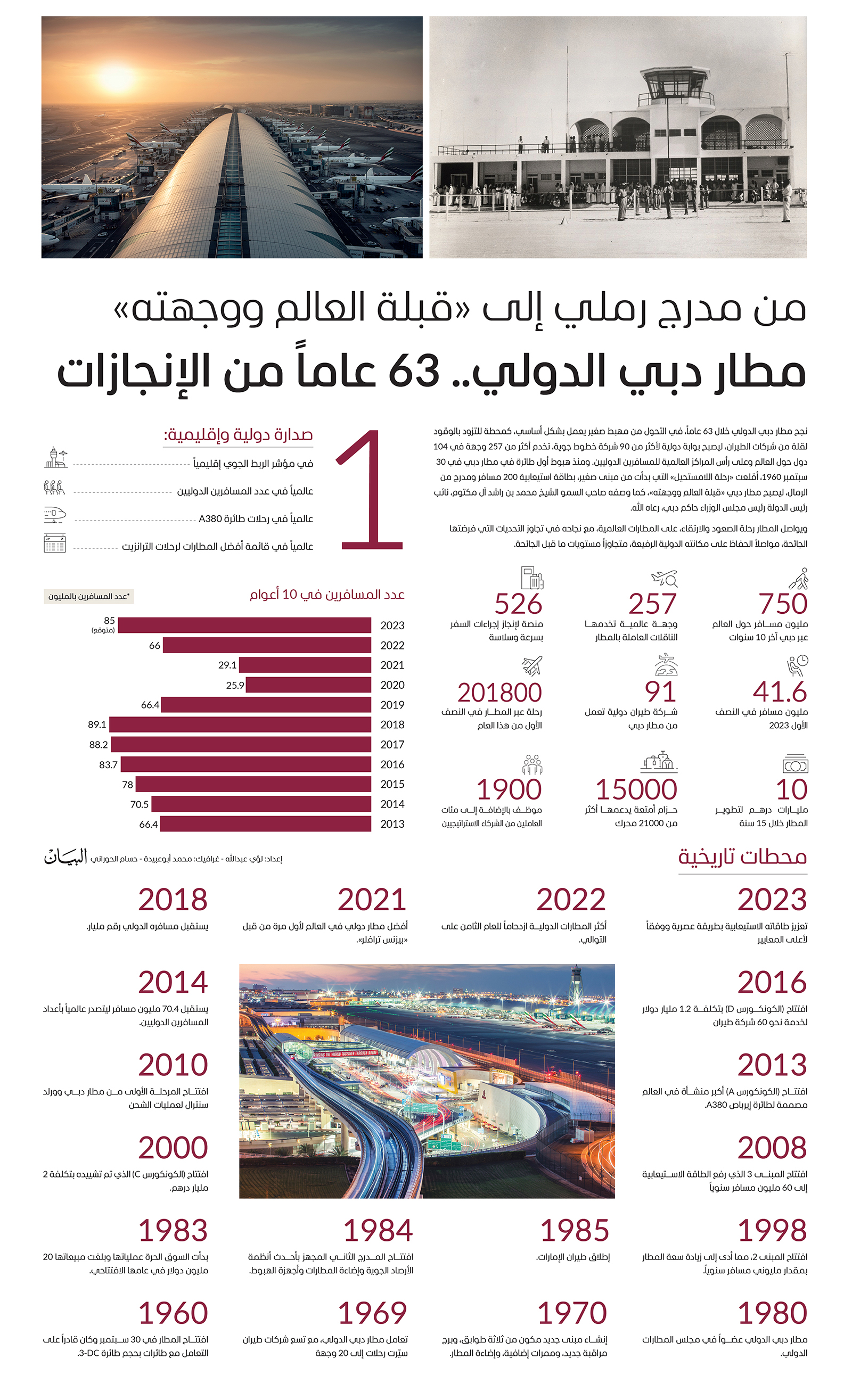 ومنذ هبوط أول طائرة في مطار دبي في 30 سبتمبر 1960، أقلعت «رحلة اللامستحيل» التي بدأت من مبنى صغير بطاقة استيعابية 200 مسافر ومدرج من الرمال ليصبح مطار دبي «قبلة العالم ووجهته»، كما وصفه صاحب السمو الشيخ محمد بن راشد آل مكتوم، نائب رئيس الدولة رئيس مجلس الوزراء حاكم دبي، رعاه الله.