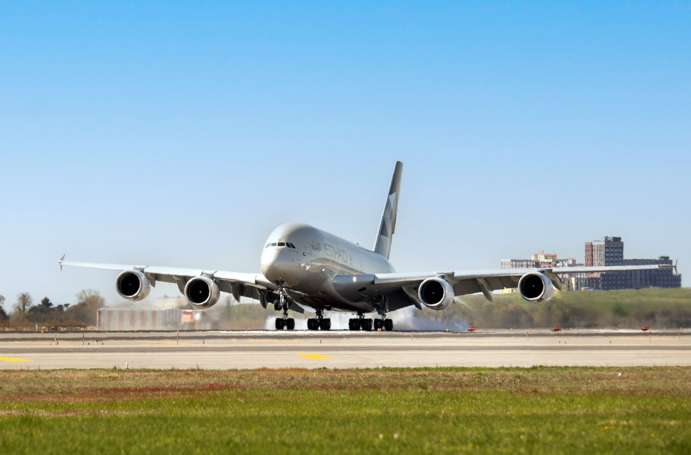 حطت رحلة الاتحاد للطيران رقم EY1، المنطلقة من أبوظبي، في مطار جون إف كينيدي بنيويورك، أمس الإثنين، لتطلق خدمات الطائرة العملاقة من طراز إيرباص A380، والتي تضم مقصورة الإيوان الأسطورية المكونة من جناح بثلاث غرف في السماء.