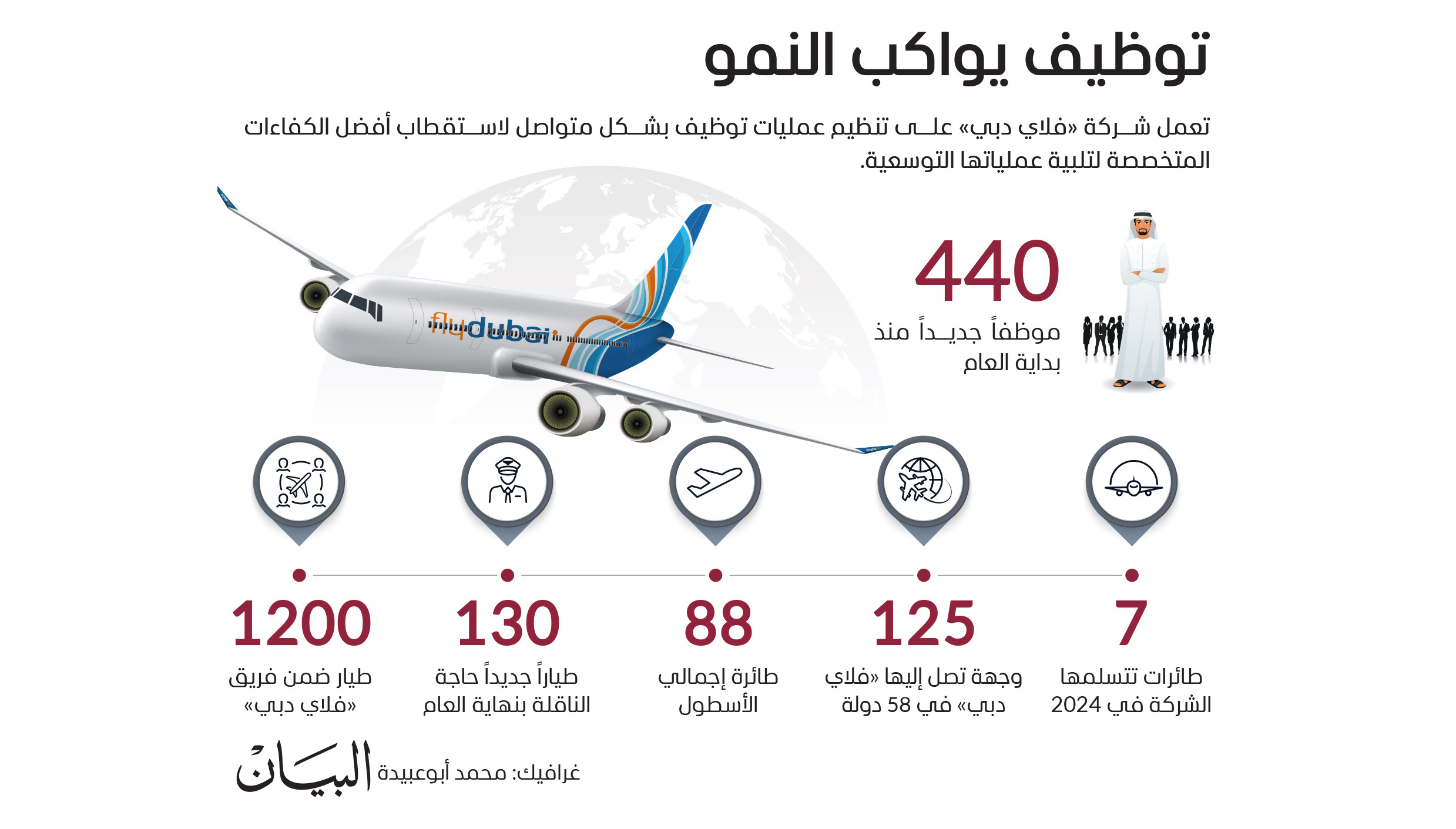 وقال: «ارتفعت أعداد الموظفين في شركة فلاي دبي لتصل اليوم إلى أكثر من 5800 موظف، يمثلون 140 جنسية، من بينهم أكثر من 1200 طيار، ونسير وفق خططنا الموضوعة لتوظيف أكثر من 130 طياراً جديداً بحلول نهاية هذا العام. ووظفت فلاي دبي هذا العام أكثر من 440 موظفاً بنمو 6 % عن العام الماضي».
