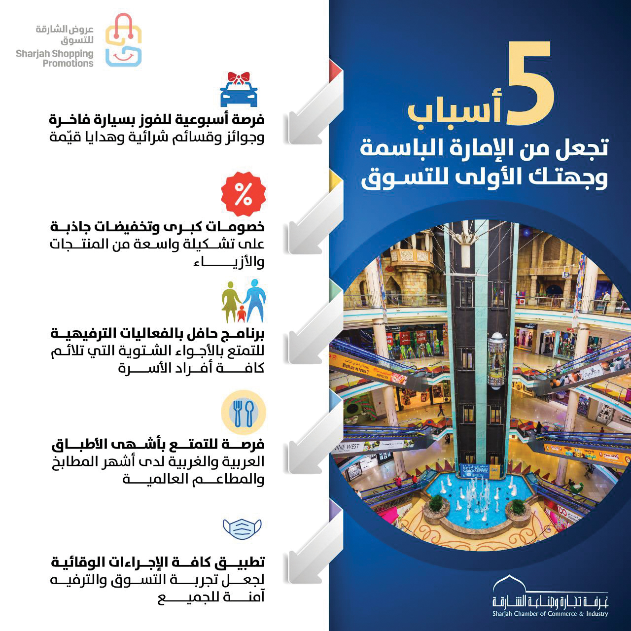 تضع اللجنة المنظمة لعروض الشارقة للتسوق والمراكز التجارية المشاركة، صحة وسلامة المتسوقين والزوار، على رأس أولوياتها، من خلال تطبيق كافة الإجراءات الوقائية، والتدابير الاحترازية، لجعل تجربة التسوق والترفيه آمنة للجميع.