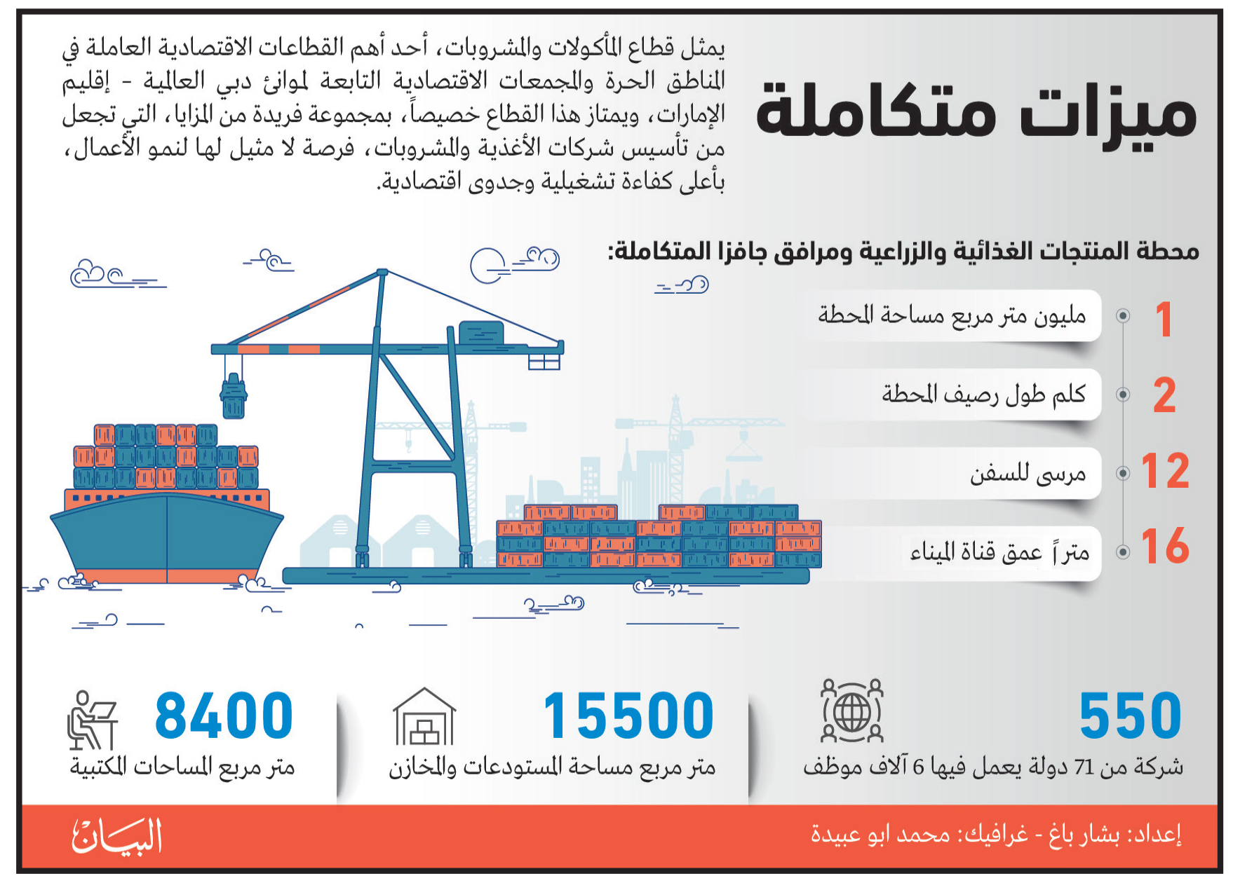 وحدد المعلم في تصريحات لـ«البيان الاقتصادي» 7 مسرعات تدعم مكانة دبي مركز عالمي لتجارة الأغذية، ويأتي في مقدمتها محطة المنتجات الغذائية والزراعية في ميناء جبل علي، وهي من أهم المرافق، التي تمتلكها الشركة لتحفيز ودعم القطاع، حيث تمتد المحطة على مساحة تصل إلى مليون متر مربع؛ وتمتلك قناة بعمق 16 متراً، بما يسمح باستقبال ناقلات البضائع العملاقة، ورصيف يضم 12 مرسى بطول يزيد على 2 كم.
