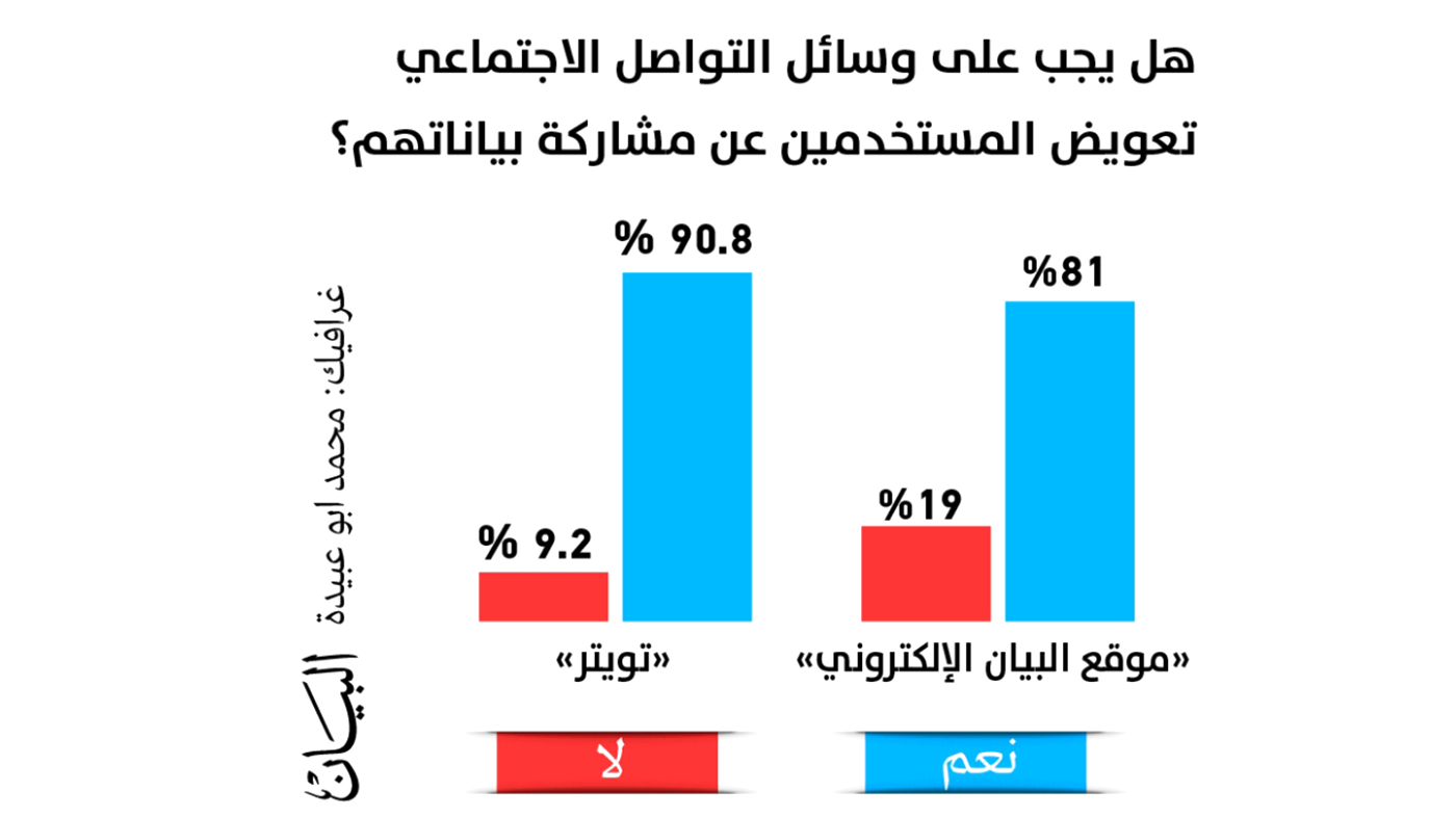 عبّر 81 % من قراء «البيان الإلكتروني» و90.8 % من متابعي البيان عبر «تويتر» عن اعتقادهم بأنه على مواقع التواصل الاجتماعي تعويض المستخدمين مقابل مشاركة بياناتهم مع المعلنين، فيما يشير خبراء قانونيون إلى أنه على الرغم من الانتشار الكبير لشبكات التواصل الاجتماعي وزيادة عدد مستخدميها الذي تجاوز لدى بعضها - مثل «فيسبوك» - أكثر من مليار مستخدم، فلا يوجد أي نص ضمن شروط الاستخدام يسمح للمستخدم بتعويض مادي مقابل استخدام بياناته الشخصية أو مشاركتها مع طرف ثالث حتى في حال مشاركة بياناته مع أطراف أخرى بغرض الإعلان أو أهداف أخرى.