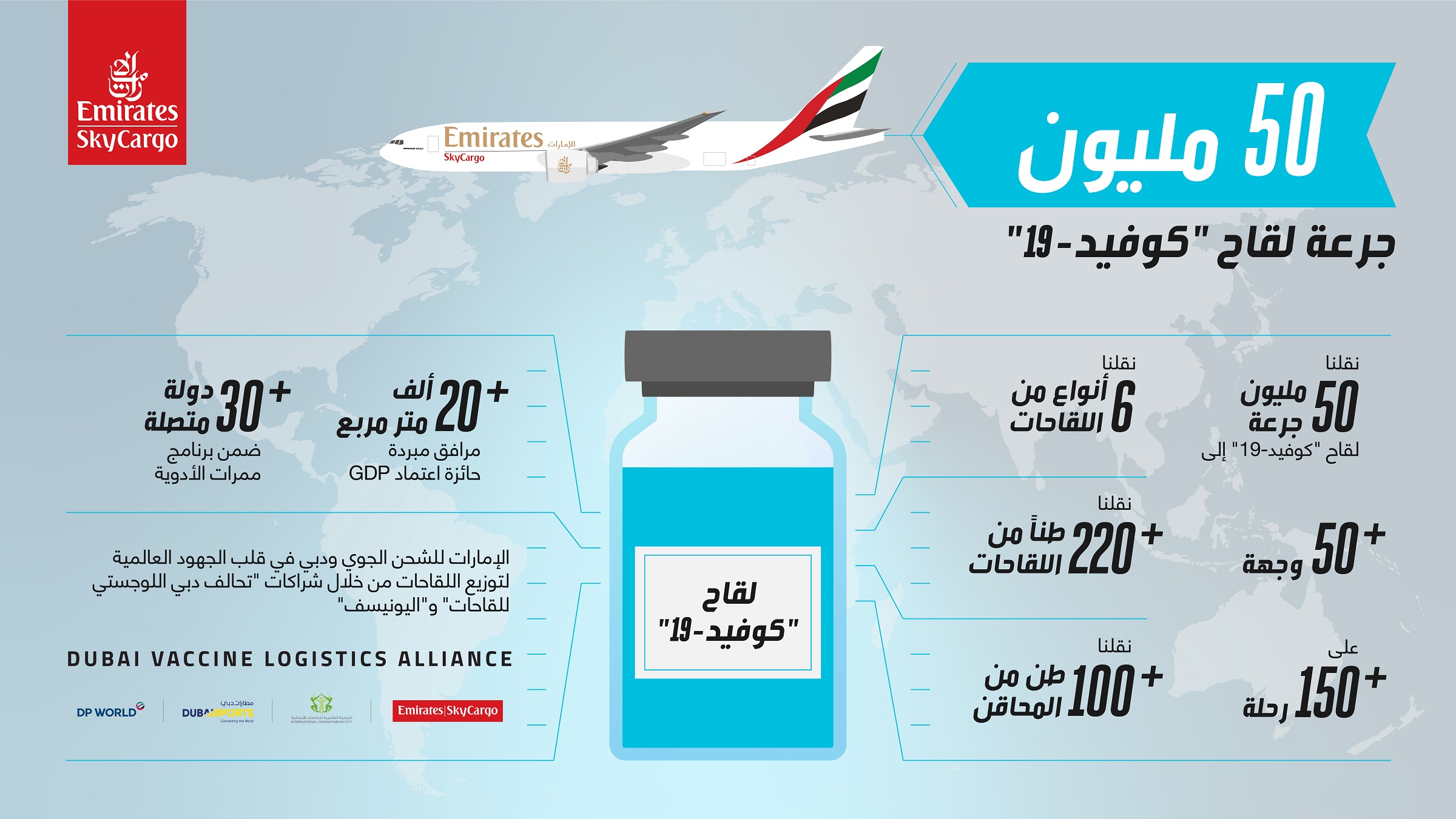 وتعد الإمارات للشحن الجوي لاعباً عالمياً رئيسياً في التوزيع الآمن والسريع للقاحات "كوفيد-19" عبر العالم، وذلك بفضل أسطولها من الطائرات الحديثة ذات الجسم العريض، وشبكتها التي تغطي حالياً أكثر من 130 وجهة عبر القارات الست، بالإضافة إلى الموقع الجغرافي الاستراتيجي لدبي مركزها الرئيس.