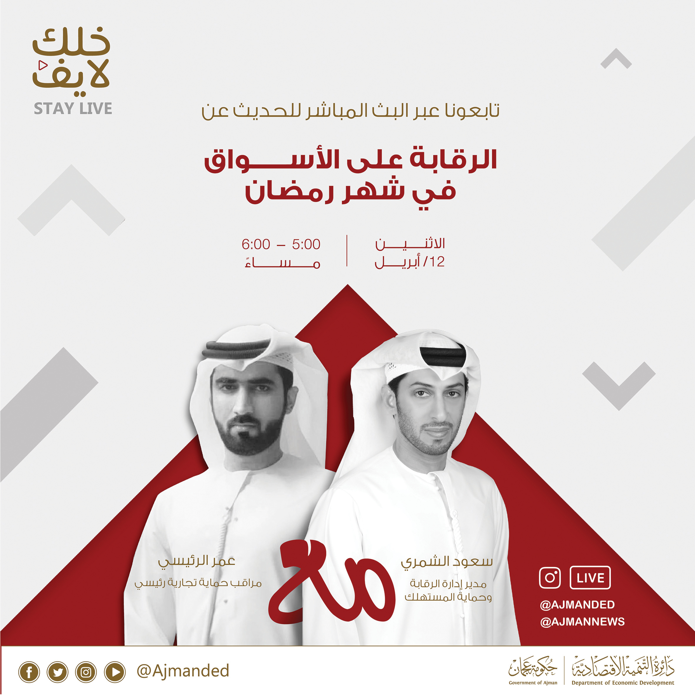 ونزف الخبر السعيد للجمهور بانطلاق أولى حلقات البرنامج يوم الاثنين الموافق 12-04-2021، حيث تم تخصيص الحلقة للتحدث عن الاستعدادات الخاصة باستقبال شهر رمضان المبارك، وسيستضيف البرنامج سعود سلطان الشمري مدير إدارة الرقابة والحماية التجارية، وعمر الرئيسي مراقب بقسم الحماية التجارية، وذلك للحديث عن دور الدائرة في ضبط ورقابة الأسواق وطمـأنة الجمهور عن توفر السلع والمنتجات التي يحتاجها مجتمع الإمارة خلال الشهر الفضيل، كما سيسعد المتحدثون بتلقي أي ملاحظات أو بلاغات أو شكاوى أو ممارسات من شأنها الإضرار بمصالح المستهلكين أو المستثمرين وتزعزع استقرار أسواق الإمارة، وننتهز هذه الفرصة لنتقدم بأسمى آيات التهاني والتبريكات إلى مقام سيدي صاحب السمو الشيخ خليفة بن زايد آل نهيان، رئيس الدولة «حفظه الله ورعاه»، وصاحب السمو الشيخ محمد بن راشد آل مكتوم، نائب رئيس الدولة رئيس مجلس الوزراء حاكم دبي، وصاحب السمو الشيخ محمد بن زايد آل نهيان، ولي عهد أبوظبي نائب القائد الأعلى للقوات المسلحة، وإلى أعضاء المجلس الأعلى حكام الإمارات وشعب الإمارات، بهذا الشهر الفضيل، ونتمناه شهراً مباركاً مليئاً بالخير واليمن والبركات على دولتنا الحبيبة.