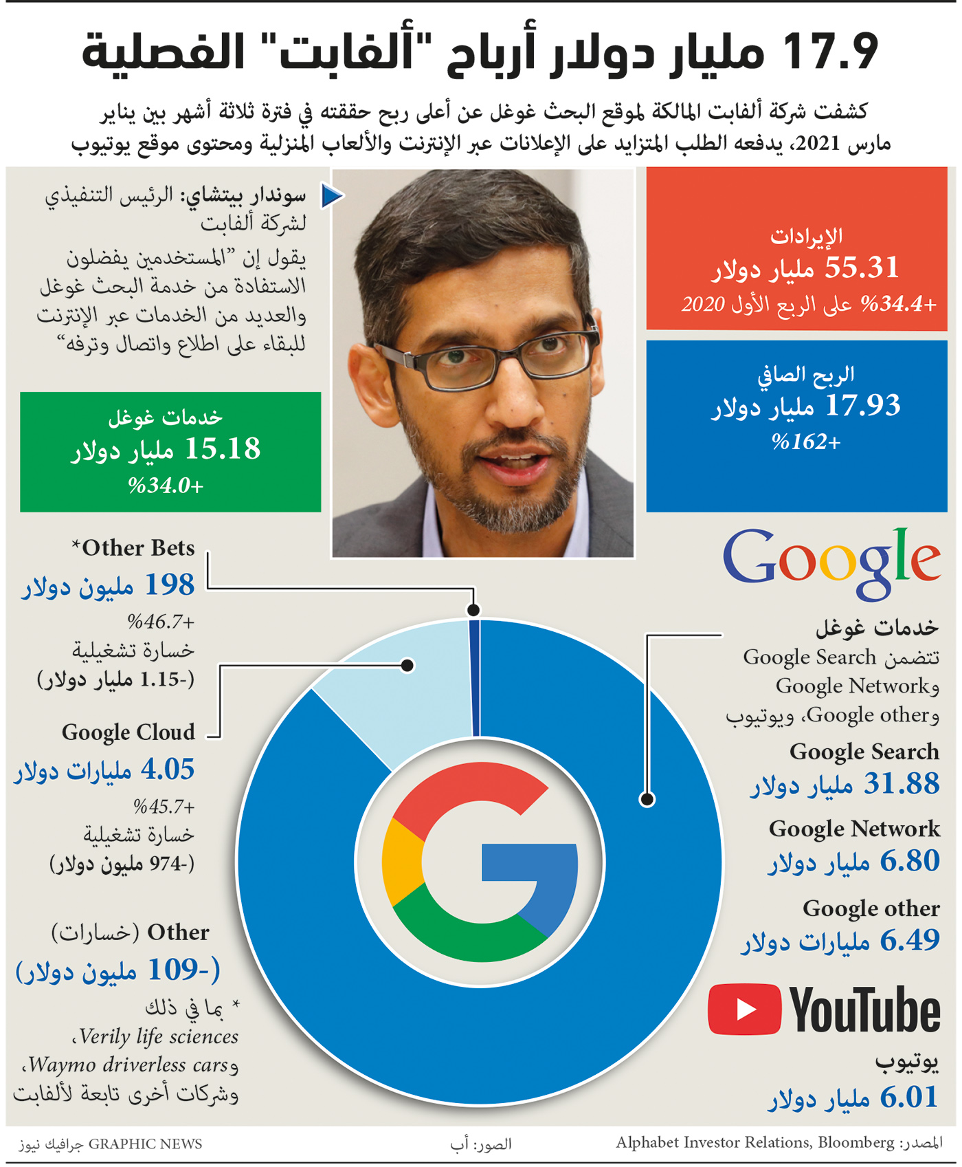 سجلت «ألفابت»، الشركة المالكة لمحرك البحث «جوجل» أرباحاً وإيرادات أفضل من التوقعات خلال الربع الأول من 2021 مع تحسن عوائد «يوتيوب» ووحدة الحوسبة السحابية وبلغ صافي الربح 17.93 مليار دولار في الثلاثة أشهر المنتهية في مارس الماضي، مقابل 6.836 مليارات دولار في الفترة المقارنة قبل عام واحد.
