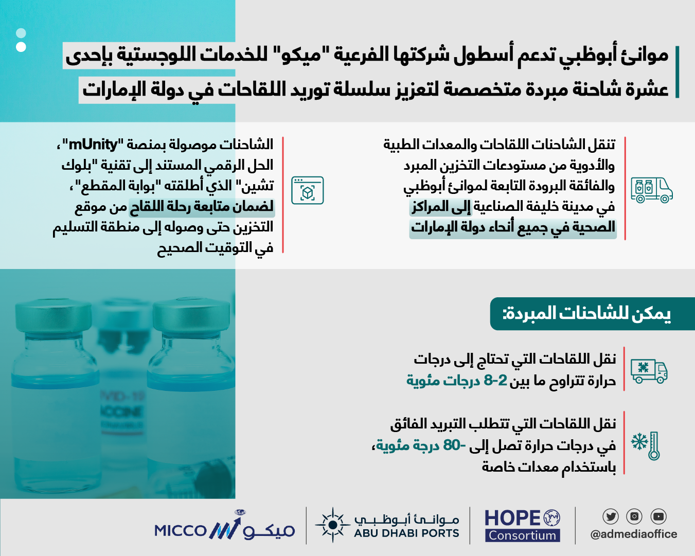 في خطوة تهدف إلى تعزيز سلسة توريد لقاحات كوفيد-19 ضمن إطار جهود "ائتلاف الأمل"، أعلنت موانئ أبوظبي، إحدى الشركات التابعة لـ"القابضة" /ADQ/ وأحد الشركاء المؤسسين للائتلاف، عن دعم أسطول شركتها الفرعية "ميكو" للخدمات اللوجستية بإحدى عشر شاحنة مبردة متخصصة، لتطوير قدراتها اللوجستية وتوسيع نطاق خدماتها خاصة في مرحلة التوصيل الأخيرة للقاحات.