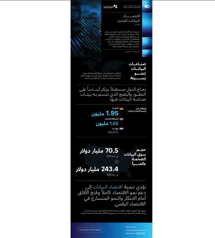 توقع تقرير حديث أصدرته مؤسسة دبي للمستقبل بالشراكة مع «اقتصادية دبي» بعنوان «اقتصاد البيانات الجديد»، أن ترتفع قيمة سوق البيانات الضخمة عالمياً من نحو 70.5 مليار دولار في عام 2020 إلى 243.4 مليار دولار بحلول عام 2027، ولفت إلى أن هذا القطاع يشكل ما بين 7% و10% من الناتج المحلي الإجمالي لعدد من الاقتصادات المتقدمة مثل ألمانيا والمملكة المتحدة وهولندا، حيث تكتسب البيانات المفتوحة أهمية كبيرة لدورها المحوري في تعزيز جهود الحكومات لبناء اقتصادٍ معرفي ذكي ومتطور، ويشهد سوق البيانات الضخمة ونظم تحليلها نمواً مطرداً على مستوى العالم، فيما تشكل عمليات جمع البيانات وتحليلها وتوظيفها قطاعاً اقتصادياً قائماً بذاته يولّد فرصاً وأسواقاً جديدة ونماذج أعمال مبتكرة غير تقليدية باستخدام خوارزميات البرمجة وتقنيات الذكاء الاصطناعي وغيرها من التقنيات المستقبلية.