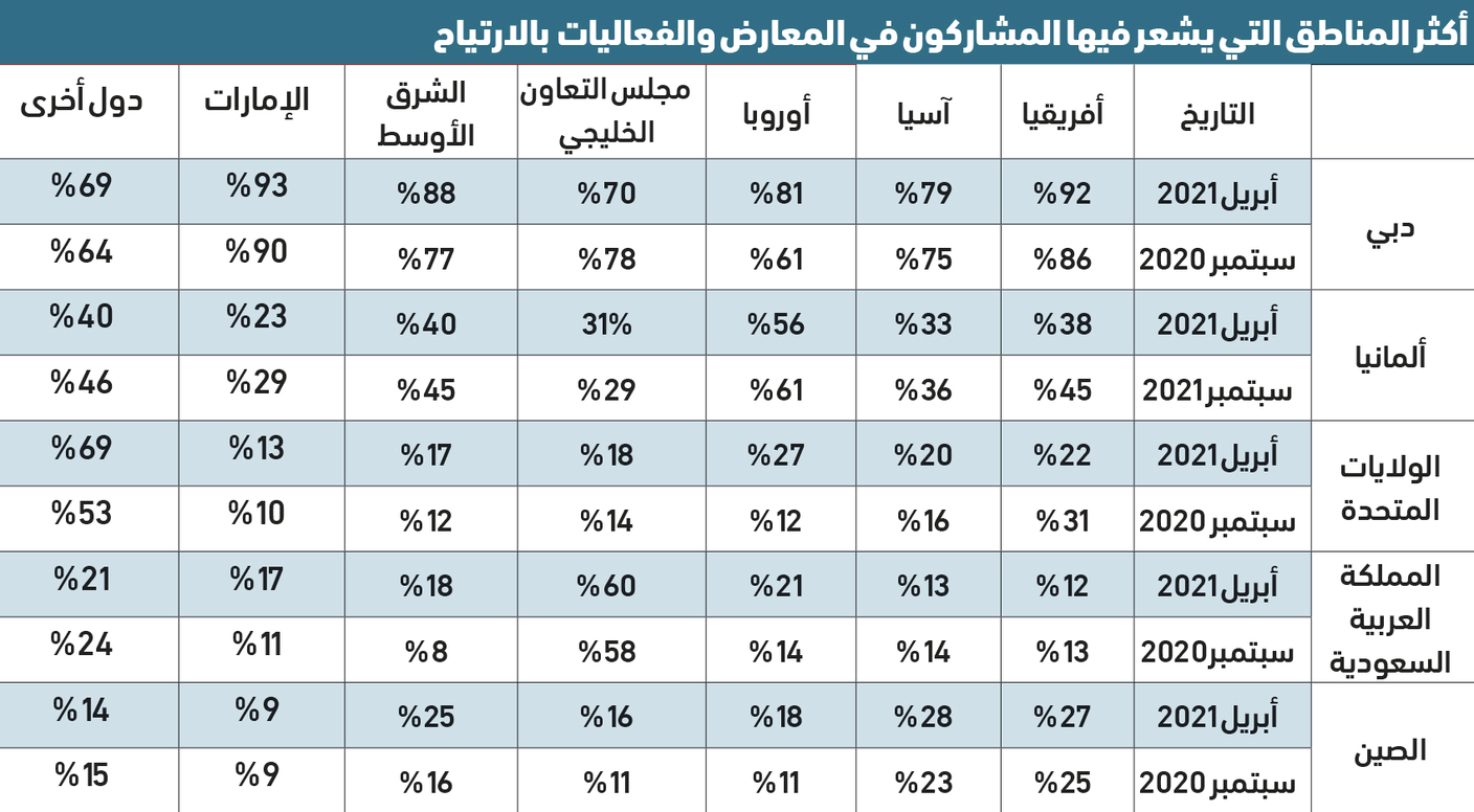 وكشف 60 %، عن استعدادهم لحضور معرض تجاري بحلول نهاية العام، بينما اعتبر المشاركون غير الراغبين في حضور أي معرض تجاري على مدار العام المقبل، أنّ المخاطر الصحية الناجمة عن السفر وفترة الحجر الصحي الإلزامية عند العودة، من أهم أسباب اتخاذهم هذا القرار.