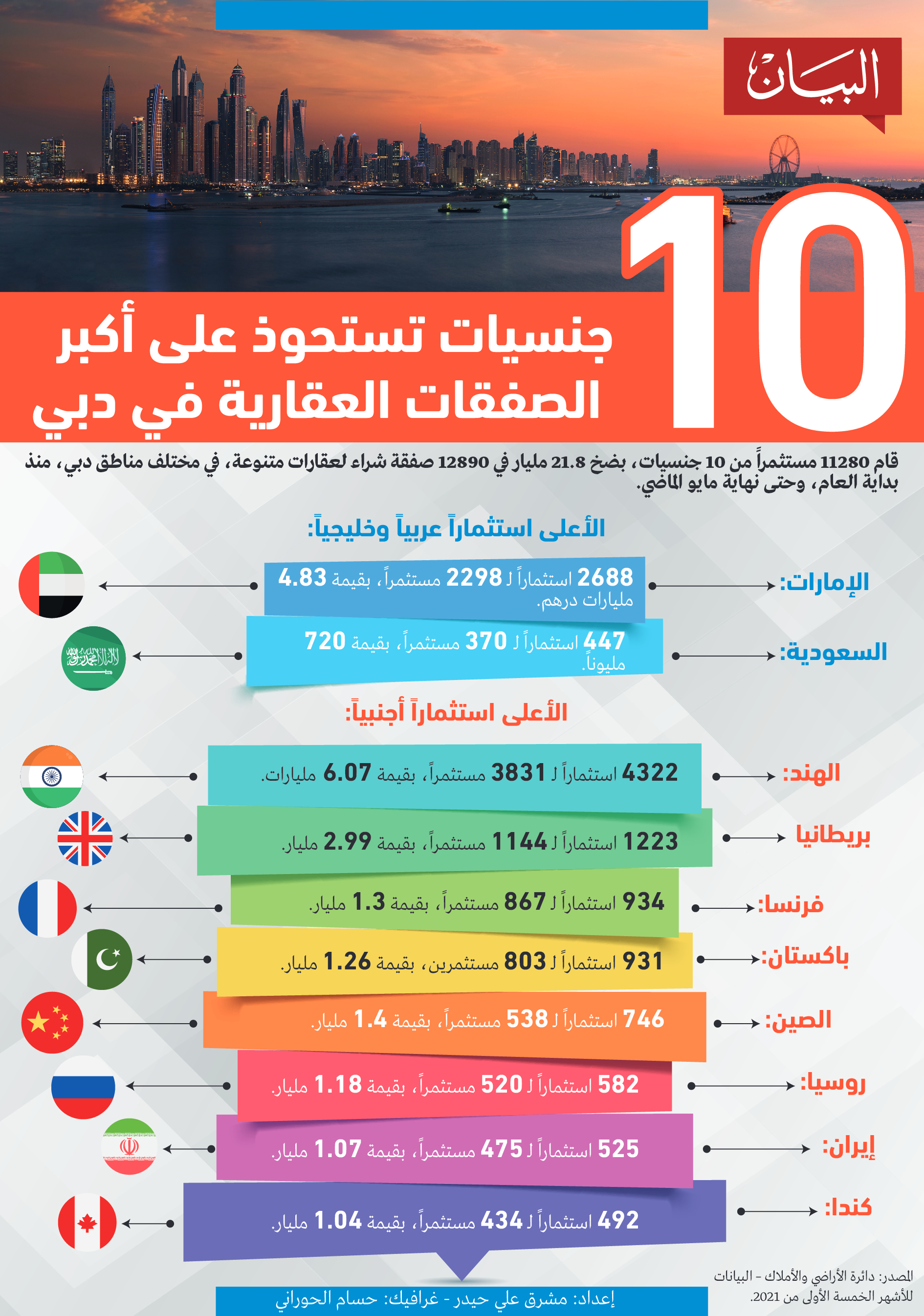 كشفت البيانات الرسمية لدائرة الأراضي والأملاك في دبي والتي اطلعت عليها «البيان» قائمة جنسيات المستثمرين الأكثر استثماراً في عقارات دبي منذ بداية 2021، وأظهرت تلك البيانات أن 11280 مستثمراً من 10 جنسيات ضخوا 21.8 مليار درهم في 12890 صفقة شراء لعقارات متنوعة في مختلف مناطق دبي من بداية العام وحتى نهاية مايو الماضي.