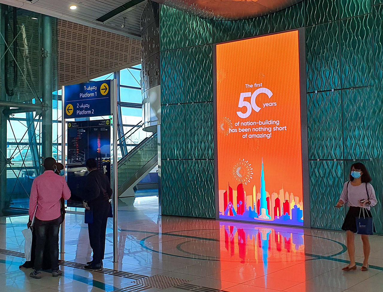 وتُعتَبَرُ منصات المترو واجهات إعلانية متطوّرة للشركات والمؤسسات العاملة في مجتمع الأعمال في الدولة والمنطقة للترويج والتسويق لمنتجاتها وخدماتها وحلولها في مختلف القطاعات والمجالات الاقتصادية والتجارية.