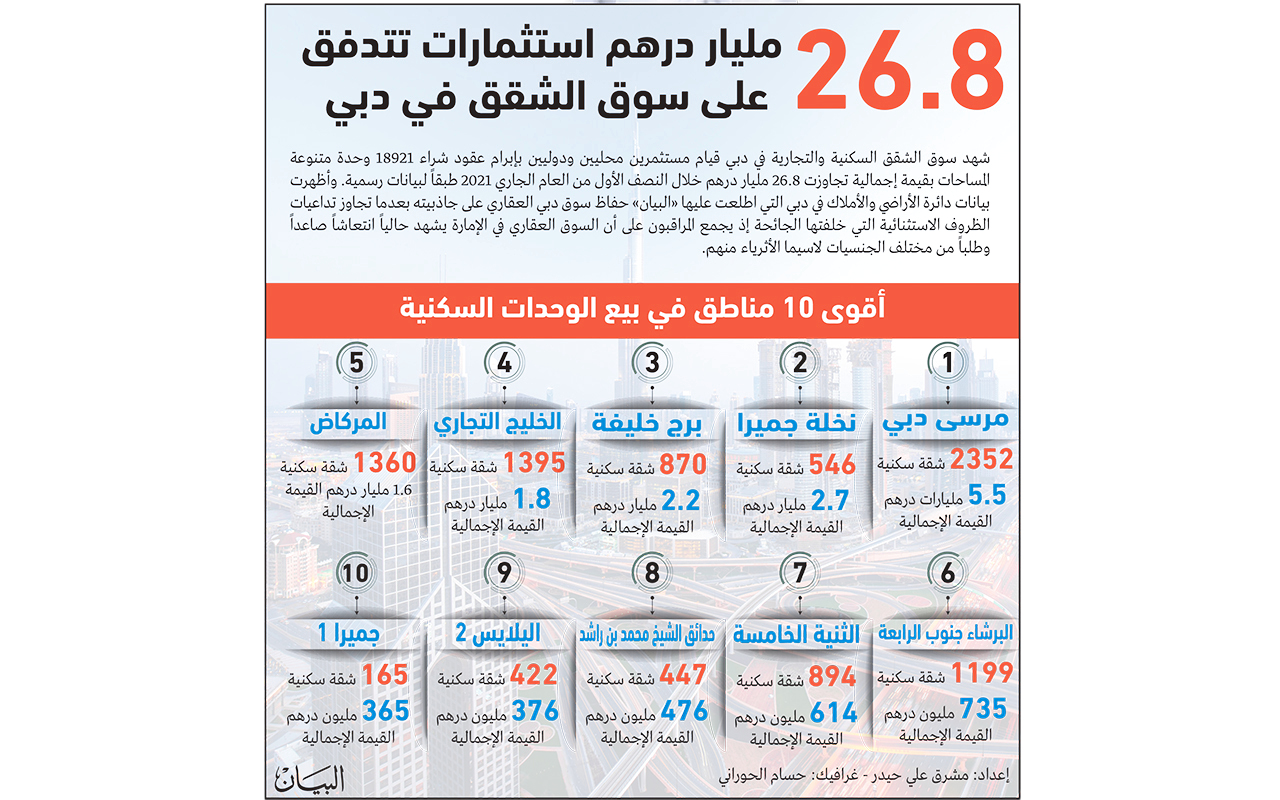 شهد سوق الشقق السكنية والتجارية في دبي قيام مستثمرين محليين ودوليين بإبرام عقود شراء 18921 وحدة متنوعة المساحات بقيمة إجمالية تجاوزت 26.8 مليار درهم خلال النصف الأول من العام الجاري 2021 طبقاً لبيانات رسمية.