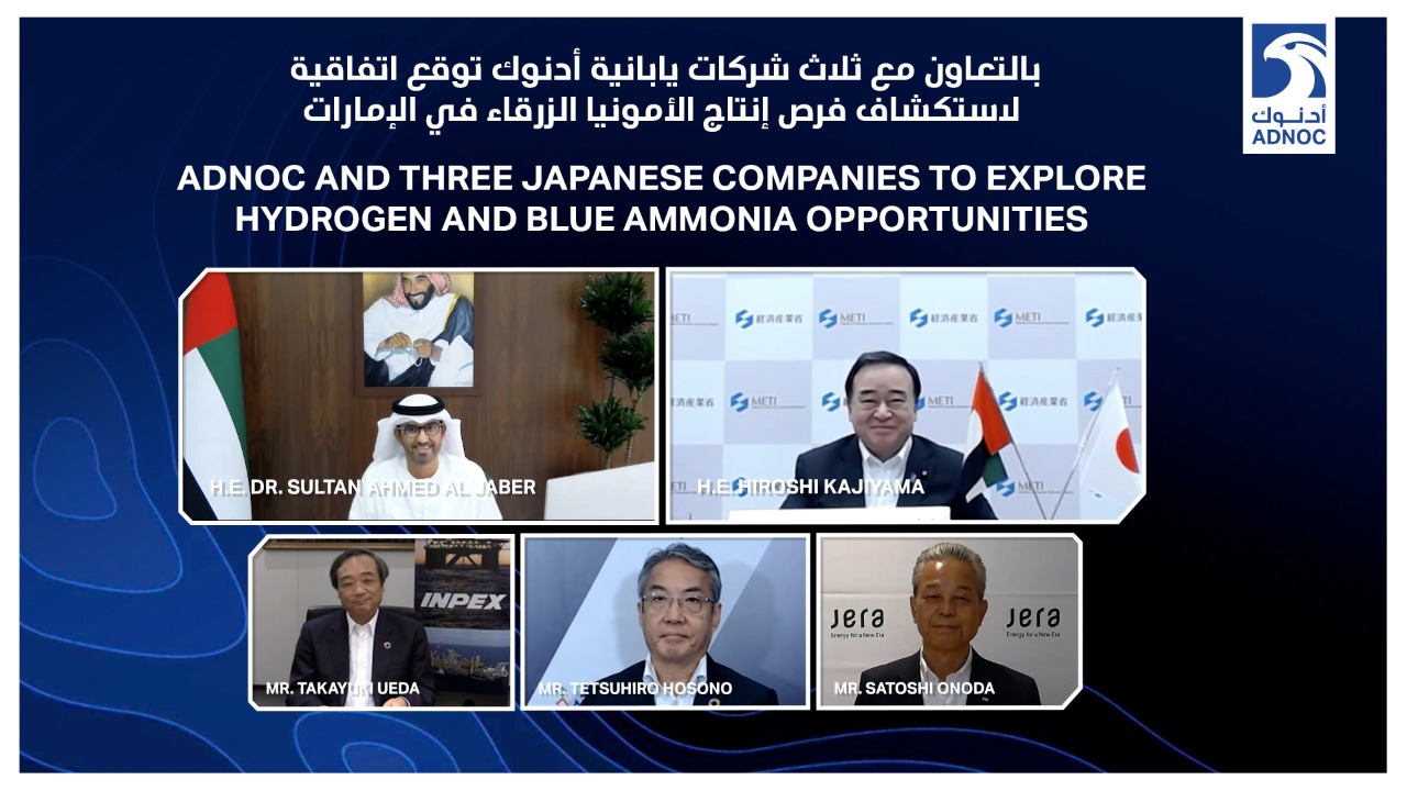 وفي أعقاب الاجتماع الذي انعقد افتراضياً، أعلنت أدنوك عن توقيع اتفاقية دراسة مشتركة مع ثلاث شركات يابانية هي إنبكس كوربوريشن (إنبكس)، و"جيرا"، و"المؤسسة الوطنية اليابانية للنفط والغاز والمعادن" لاستكشاف الإمكانات التجارية لإنتاج الأمونيا الزرقاء في دولة الإمارات.