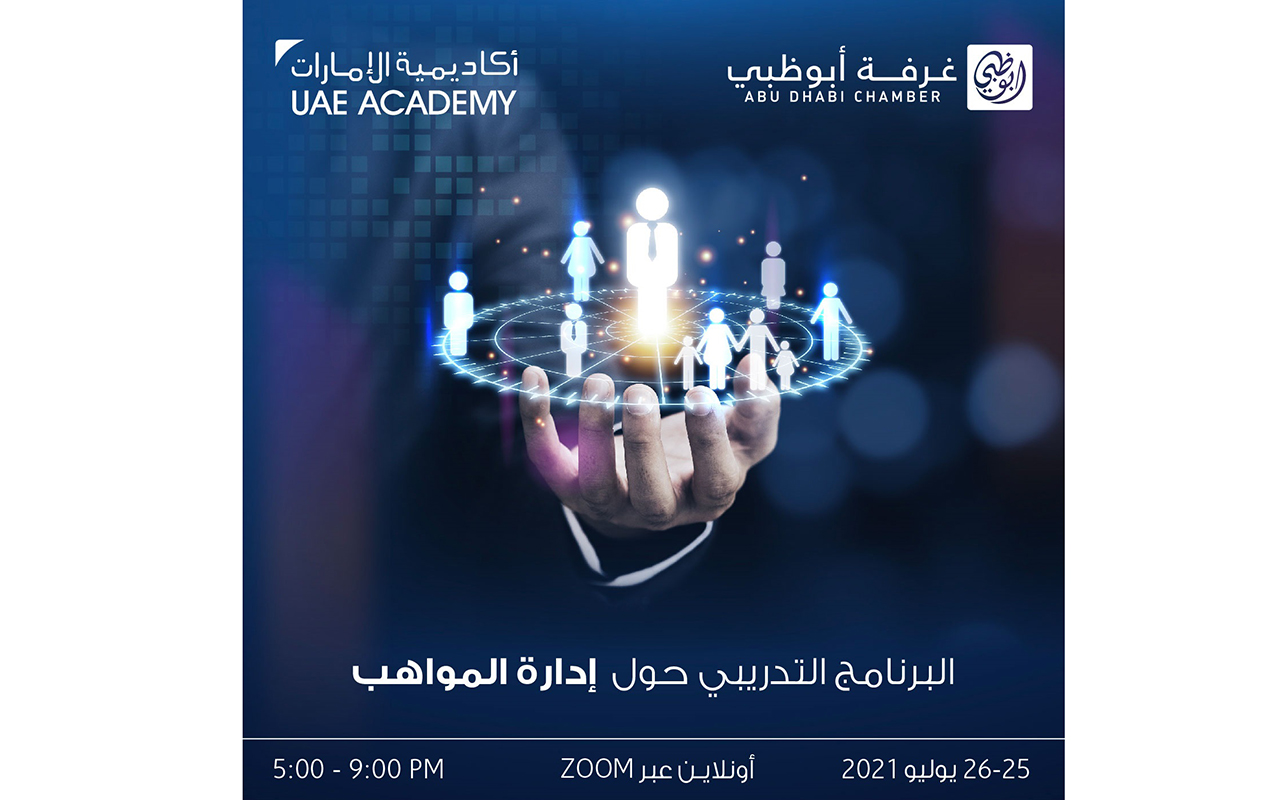 تطلق غرفة تجارة أبوظبي الأحد المقبل برنامجا تدريبيا حول إدارة المواهب. ويستمر البرنامج على مدار يومين، ويتم تنفيذه عن بعد عبر تقنية "زووم ".