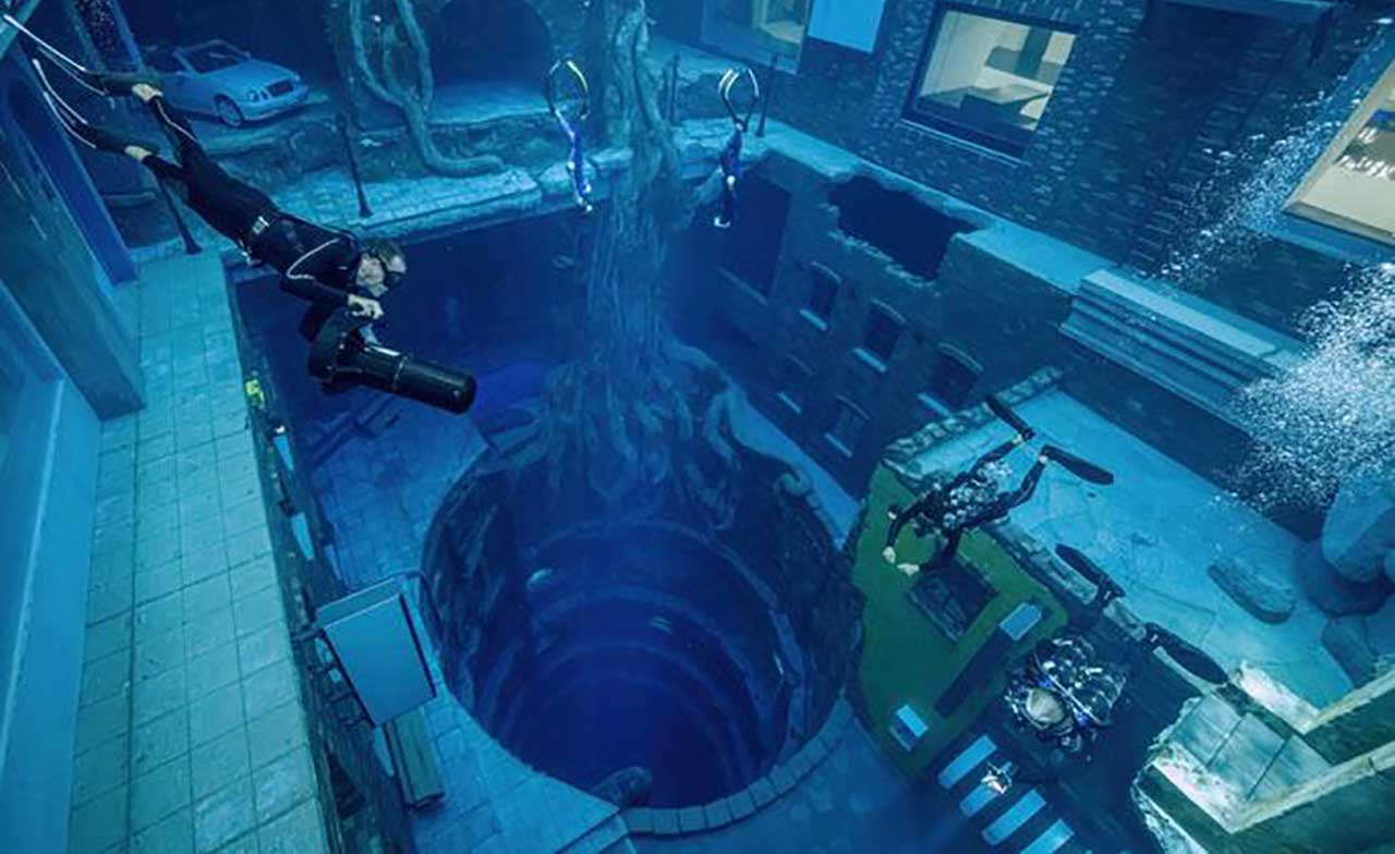 ونقلاً عن تقرير موقع موسوعة "غينيس" الأرقام القياسية، يقع المسبح القياسي بمنطقة ند الشبا بعمق ضخم يقدر بحوالي 60.02 متراً، وبسعة 14 مليون لتر من المياه، أي ما يعادل 6 حمامات سباحة أولمبية. كما ويحتضن "ديب دايف دبي" مدينةً غارقة يمكن للغواصين من جميع المستويات استكشاف شوارعها المهجورة، فضلاً عن وجود شقة ومرآب وأروقة وعدة مفاجآت أخرى.