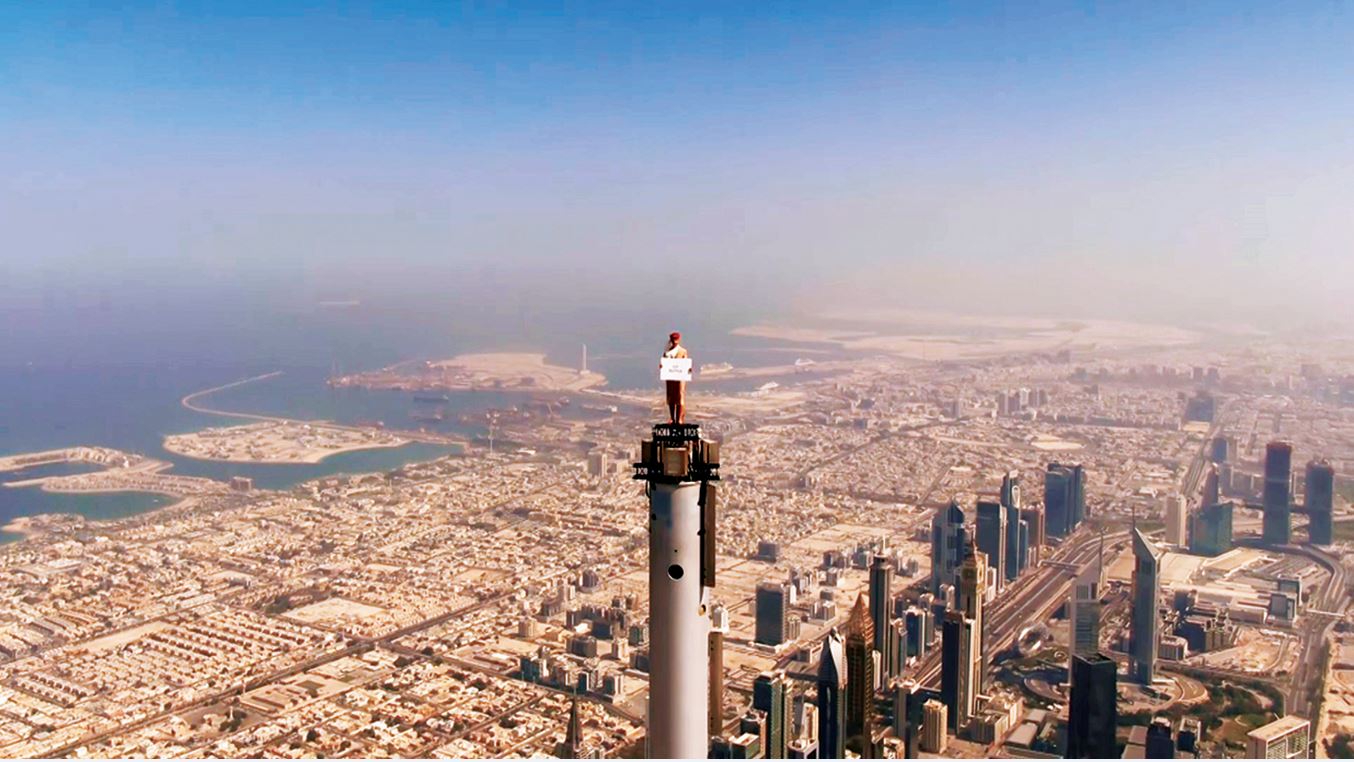 ويعد إعلان «طيران الإمارات» الجريء، الذي صوّر على ارتفاع 828 متراً فوق سطح الأرض، واحداً من أشهر الإعلانات التي تم تصويرها في الأعالي، وقام بتصميمه وإخراجه فريق العلامة التجارية لطيران الإمارات بمساعدة شركة «Prime Productions AMG»، ومقرها دبي. وسوف يتم تعديل الإعلان ليلائم مختلف الأسواق عبر شبكة خطوط «طيران الإمارات»، مع تضمين رسائل ذات صلة، حيث ستطلق أول حملة تلفزيونية في المملكة المتحدة.