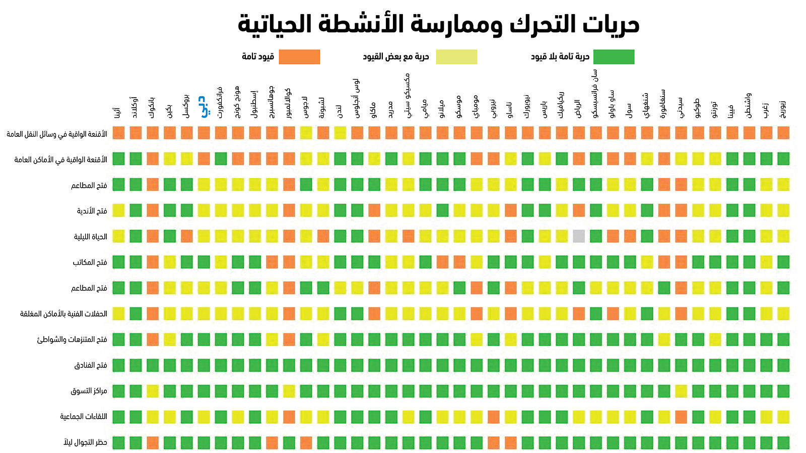 وعن حرية التحرك وممارسة الأنشطة الحياتية داخل المدينة، تطرق المرصد إلى 13 تجربة من تجارب الحرية، وذكر أن دبي تتيح الحرية الكاملة في 5 تجارب، وهي فتح المكاتب أمام الزوار، فتح المتنزهات والشواطئ، فتح الفنادق، فتح مراكز التسوق، ورفع حظر التجوال ليلاً. وأضاف أن دبي تمنح زوارها حرية مع بعض القيود في 6 تجارب، وهي المطاعم، الأندية، الحياة الليلية، المتاحف، الحفلات الفنية في قاعات مغلقة، وعقد اللقاءات الجماعية، فيما تفرض قيوداً مشددة تماماً على تجربتين، وهما ارتياد وسائل النقل العامة من دون ارتداء قناع واقي، وكذلك التواجد في الأماكن العامة من دون القناع.