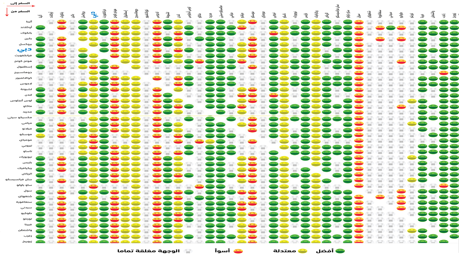 وأفاد المرصد بأن دبي تتيح تجربة معتدلة للقادمين من أثينا، أوكلاند، بانكوك، بكين، بروكسل، فرانكفورت، هونغ كونغ، جوهانسبرغ، كوالا لمبور، لشبونة، لندن، لوس أنجليس، ماكاو، مدريد، مكسيكوسيتي، ميامي، ميلانو، ناساو «عاصمة جزر البهاماس»، نيويورك، باريس، ريكيافيك، الرياض، سان فرانسيسكو، سول، شنغهاي، سنغافورة، سيدني، طوكيو، تورنتو، فيينا، واشنطن، وزيوريخ.