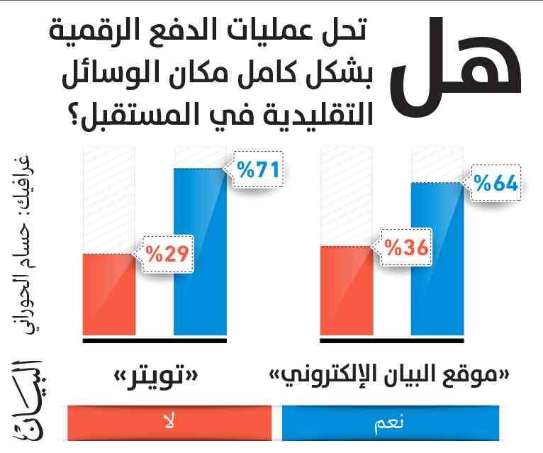ورداً على سؤال الاستطلاع مفاده (هل تعتقد أن عمليات الدفع الرقمية ستحل بشكل كامل مكان الدفع التقليدي في غضون سنوات؟)، أبدى 71% من المشاركين في الاستطلاع على موقع «تويتر»، موافقتهم على أن عمليات الدفع الرقمية ستحل محل نظيرتها التقليدية في غضون سنوات، مقابل 29% رفضوا ذلك فيما كشف الاستطلاع عبر موقع «البيان الإلكتروني» أن 64% قالوا نعم، فيما قال 36% لا.