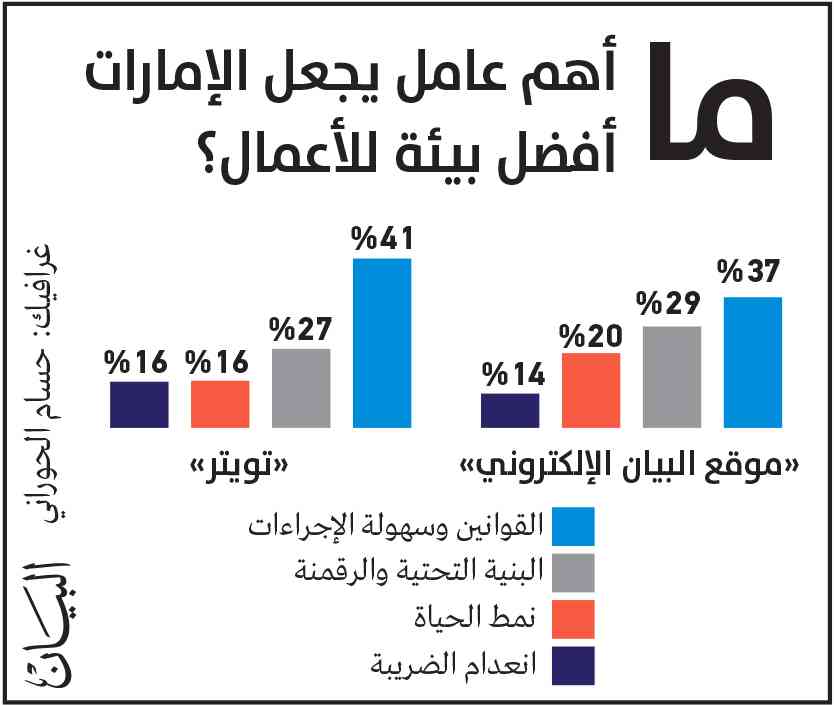 وفي الاستطلاع على صفحة «البيان» بموقع التواصل الاجتماعي «تويتر» اختار 41% من المشاركين القوانين وسهولة الإجراءات، فيما اختار 27% البنية التحتية والرقمنة، بينما اختار 16% عامل نمط الحياة، كما ذهبت نفس النسية إلى انعدام الضريبة.