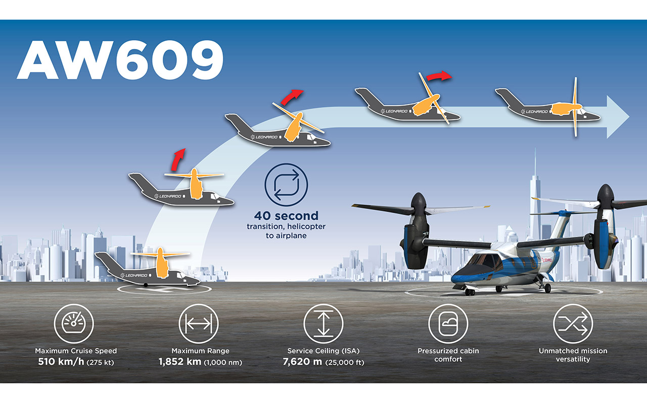 ويأتي استعراض طائرة AW609 TiltRotor في معرض دبي للطيران 2021 تفعيلاً للعلاقة الوثيقة بين ليوناردو وشركائها الإقليميين، إذ ستكون هذه المرة الأولى التي تظهر فيها الطائرة في معرضٍ متخصصٍ في الطيران والدفاع خارج أوروبا والولايات المتحدة. وتعد طائرة AW609 إنجازاً هندسياً فريداً، إذ تتميز بقدرتها على تغيير اتجاه مراوحها في أقل من 60 ثانية، وبإمكانها أن تقلع عمودياً مثل طائرة هليكوبتر، كما أنها تقدم أداءً يماثل الطائرة التقليدية. ويمكن لطائرة AW609 الطيران بسرعة تزيد على 500 كم/ ساعة، فضلاً عن قدرتها على تنفيذ مجموعةٍ متنوعةٍ من المهام، من نقل الركاب والرعاية الطبية إلى الحماية المدنية والبحث والإنقاذ. ويبلغ مدى AW609 TiltRotor نحو 1,400 كم، ويزيد إلى أكثر من 2,000 كم باستخدام خزانات خارجية احتياطية.