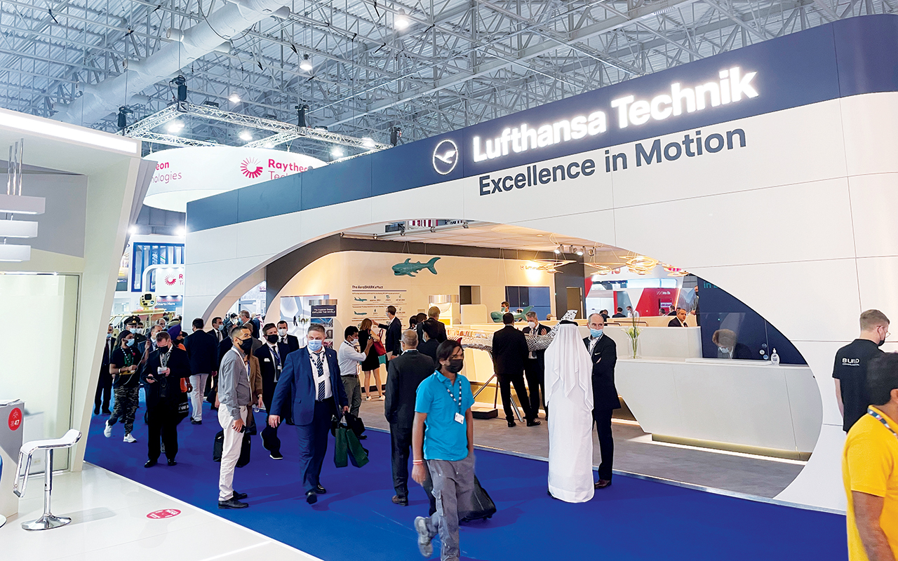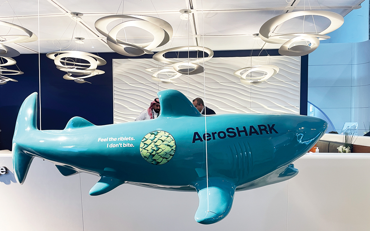 عرض جناح «لوفتهانزا تيكنيك» بمعرض دبي للطيران تقنية تلبيس جسم الطائرات بطبقة تشبه بتركيبها جلد سمك القرش، قامت بتطويرها شركة BASF الألمانية المتخصصة بصناعة الطلاءات والكيماويات، فيما تقوم «لوفتهانزا تيكنيك» حالياً بتجربة هذه التقنية واسمها AeroShark بعدد من الطائرات التابعة لطيران لوفتهانزا. وتتكون الطبقة الرقيقة من نسيج مكون من ملايين من «الأضلاع» الصغيرة، التي تأخذ شكل الموشور لا يزيد ارتفاع الواحدة منها على 50 ميكرو متر، ما يجعل استخدامها مرن وقابل للتخصيص.