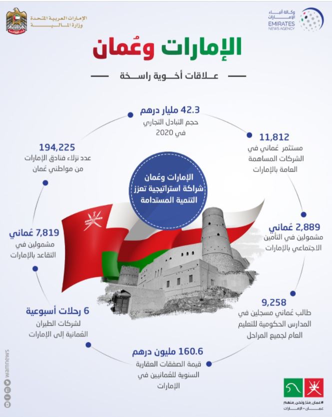 أكدت وزارة المالية قوة الشراكة الاستراتيجية بين الإمارات وسلطنة عُمان الشقيقة في مختلف المجالات لا سيما المالية والاقتصادية والاستثمارية والذي يظهر من خلال الأرقام والبيانات الاحصائية لعام 2020 إذ تؤكد الإمارات حرصها على تعزيز آفاق التعاون المشترك في ظل العلاقة الأخوية الراسخة التي تحظى بدعم ورعاية من قيادتي البلدين الشقيقين بما يحقق مزيدا من الازدهار والتقدم .