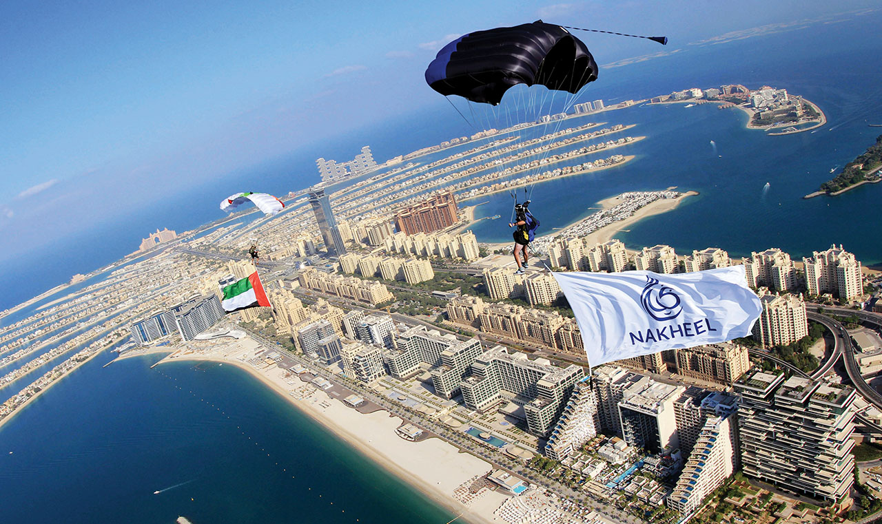 ورفع مظليون علم دولة الإمارات خفاقاً وفوق نخلة جميرا التحفة المعمارية والأيقونة الهندسية الشهيرة عالمياً ووجهة الترفية والسياحة المميزة في دبي وذلك على هامش احتفالات شركة نخيل باليوم الوطني الخمسين لدولة الإمارات العربية المتحدة.