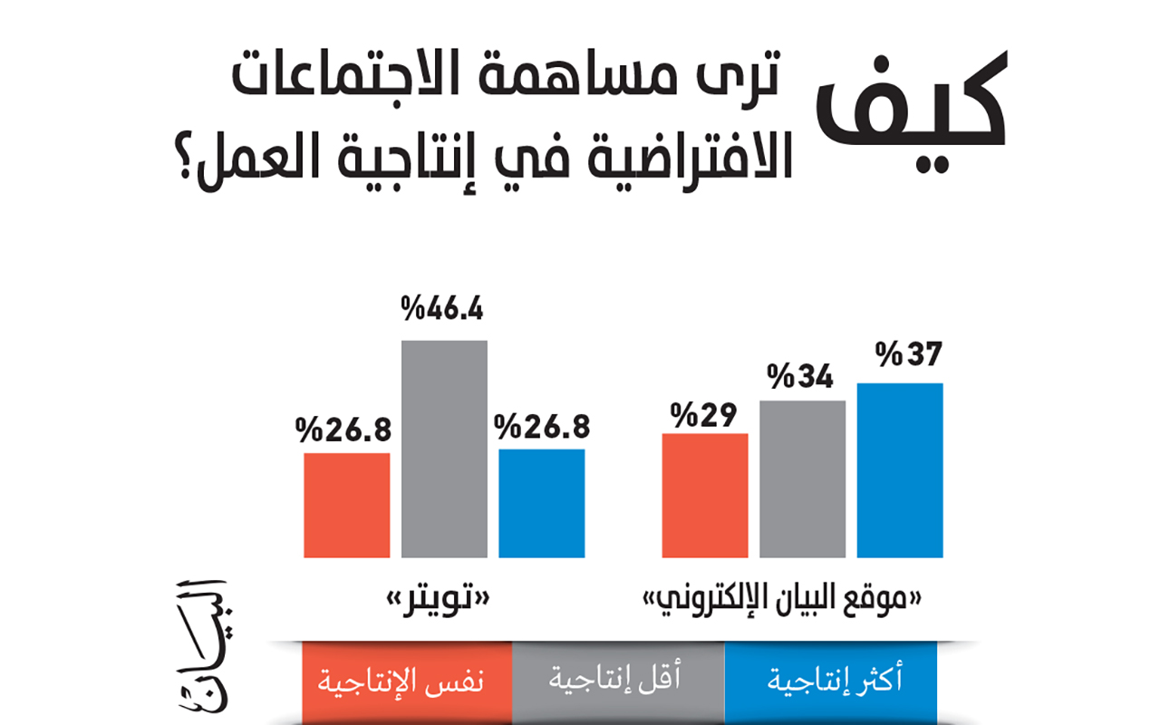 وذكر 37% من القرّاء المشاركين في استطلاع «البيان الإلكتروني» الأسبوعي، أن الاجتماعات الافتراضية توفر إنتاجية أكثر بالمقارنة مع الاجتماعات الواقعية، فيما قال 34% إنها تحقق إنتاجية أقل، بينما رأى 29% أنها تحقق نفس الإنتاجية. وعلى موقع «تويتر»، ذكر 26.8 % أن الاجتماعات الافتراضية تحقق إنتاجية أكثر، فيما قال 46.3 % إنها تحقق إنتاجية أقل، بينما رأى 26.8 % أنها تحقق نفس الإنتاجية.