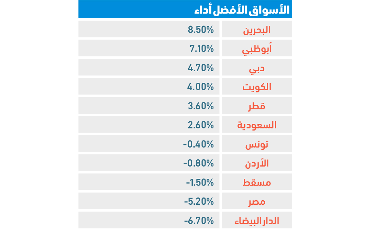 وجاءت بورصة البحرين في المركز الأول، بعد صعودها بنسبة 8.5%، وفى المركز الثالث جاءت بورصة الكويت، حيث ارتفع مؤشرها الرئيس 4%، ومؤشرها العام 3.9%، وحلت بورصة قطر رابعة، مع ارتفاع مؤشرها 3.6% إلى 12948 نقطة، وفي المركز الخامس جاءت السعودية، مع ارتفاع مؤشرها 2.6% إلى 12590 نقطة.