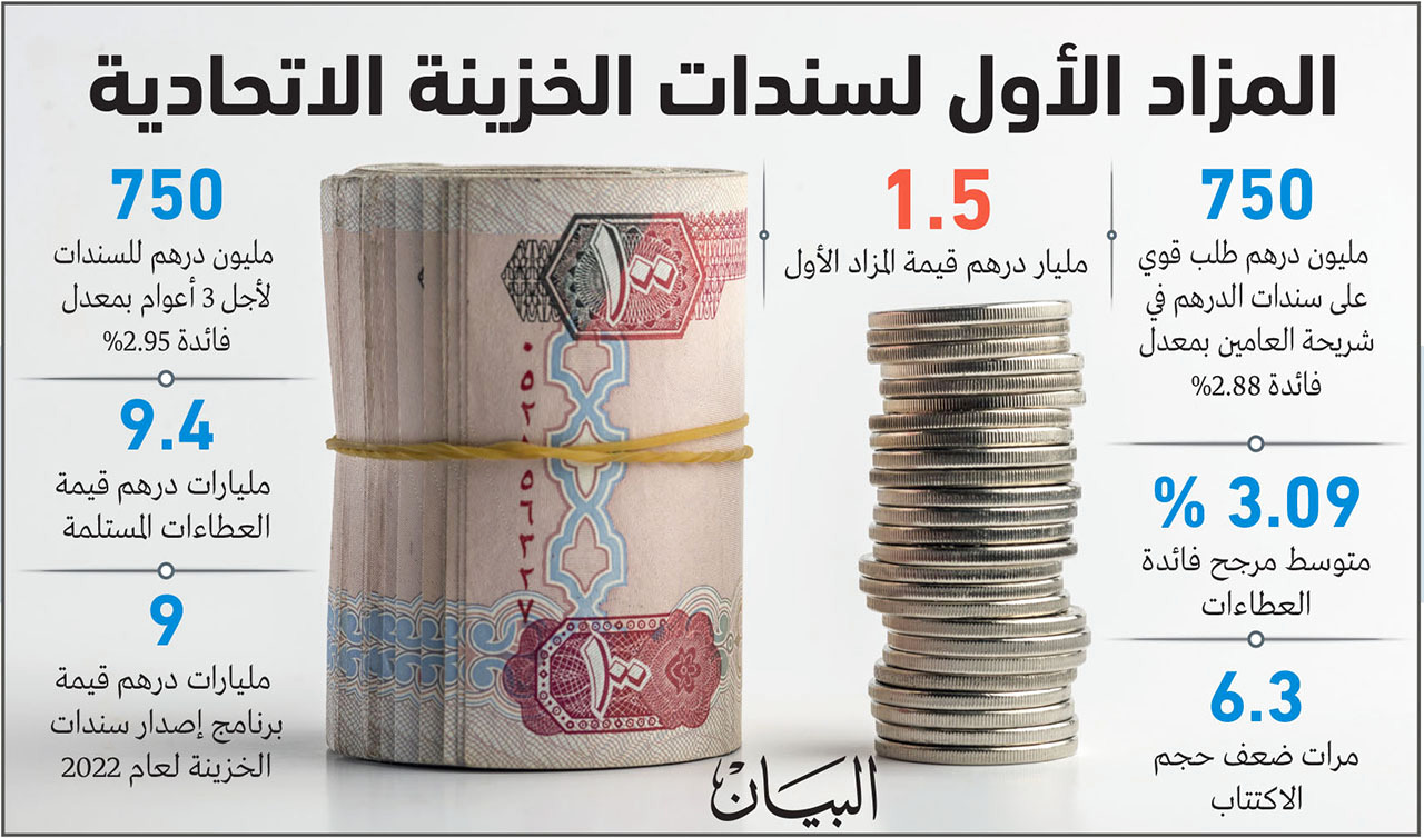 أعلنت دولة الإمارات، ممثلة بوزارة المالية بصفتها الجهة المصدرة، وبالتعاون مع مصرف الإمارات المركزي، بصفته وكيل الإصدار والدفع، أمس، نتائج المزاد الأول لإصدار سندات الخزينة الاتحادية (T-Bonds)، المقوّمة بالدرهم، مع معيار قياسي لحجم المزاد يصل إلى 1.5 مليار درهم (حوالي 400 مليون دولار)، وذلك ضمن برنامج إصدار سندات الخزينة بقيمة 9 مليارات درهم لعام 2022.