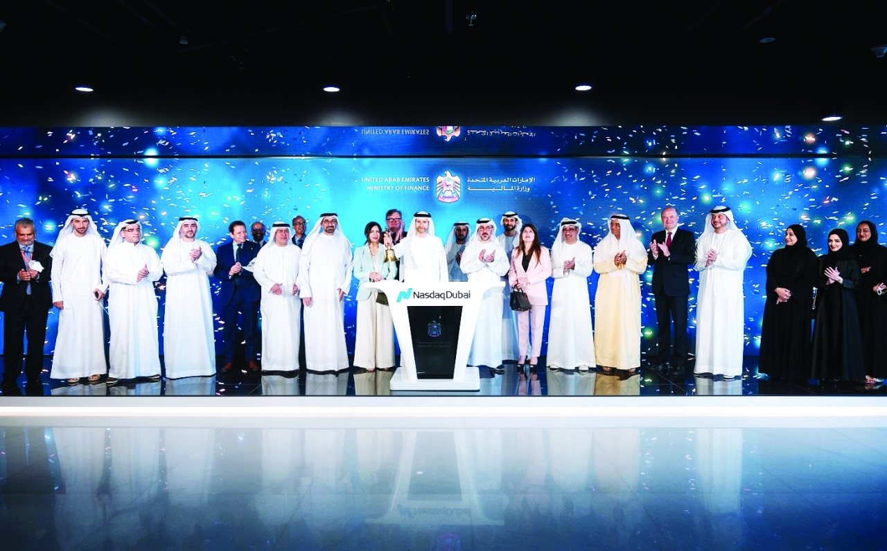 قرع معالي محمد بن هادي الحسيني وزير دولة للشؤون المالية، صباح أمس الجرس في ناسداك دبي احتفالاً بإدراج وتداول أول إصدار من سندات الخزينة الحكومية المقومة بالعملة المحلية الدرهم والتي تصدرها الحكومة الاتحادية عبر وزارة المالية، بقيمة إجمالية بلغت 1.5 مليار درهم.