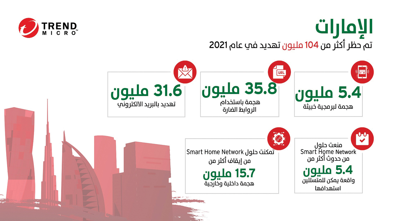 وعلى صعيد دولة الإمارات، منعت حلول تريند مايكرو ما يزيد على 104 ملايين تهديد سيبراني. وتضمن ذلك 31.6 مليون هجمة عبر البريد الإلكتروني، بينما قامت بالتصدي لأكثر من من 5.4 ملايين هجمة لبرمجيات خبيثة، في حين منعت ما يقارب 36 مليون هجمة تتعلق بضحايا الضغط على الروابط الضارة، إلى جانب ذلك ذكر التقرير بأن الشبكات المنزلية في الإمارات كانت عامل جذب لمجرمي الإنترنت الذين استهدفوا الأنظمة والأجهزة والشبكات، وبهذا الصدد حجبت حلول «Smart Home Network» من تريند مايكرو أكثر من 15.7 مليون هجمة داخلية وخارجية، وكذلك منعت حصول أكثر من 5.4 ملايين هجمة من القراصنة الساعين لاستهداف أو السيطرة على الشبكات المنزلية.