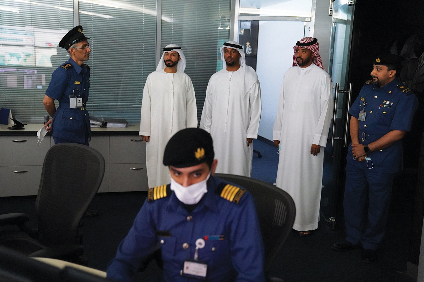 كما زار الوفد غرفة التحكم والسيطرة، واستمع إلى شرح من صالح الحمادي عن مميزات الغرفة والبرامج التي تتضمنها، حيث تعد غرفة التحكم والسيطرة بجمارك دبي هي أول غرفة عمليات جمركية على مستوى المنطقة والوطن العربي، وتقوم بمتابعة الأعمال الجمركية الأمنية على مدار الساعة، والعديد من المهام، منها متابعة كاميرات المراقبة الموزعة على المنافذ الجمركية البرية والبحرية والشحن الجوي، وعددها 500 كاميرا، كما تعمل غرفة التحكم والسيطرة على 23 برنامجاً جمركياً أمنياً على مدار الساعة لمتابعة أعمال التفتيش والشحنات والاستفسار عن الحاويات وتلقي المكالمات الهاتفية والاستفسارات من المراكز الجمركية ونشر التعاميم الأمنية على المنافذ المختلفة.