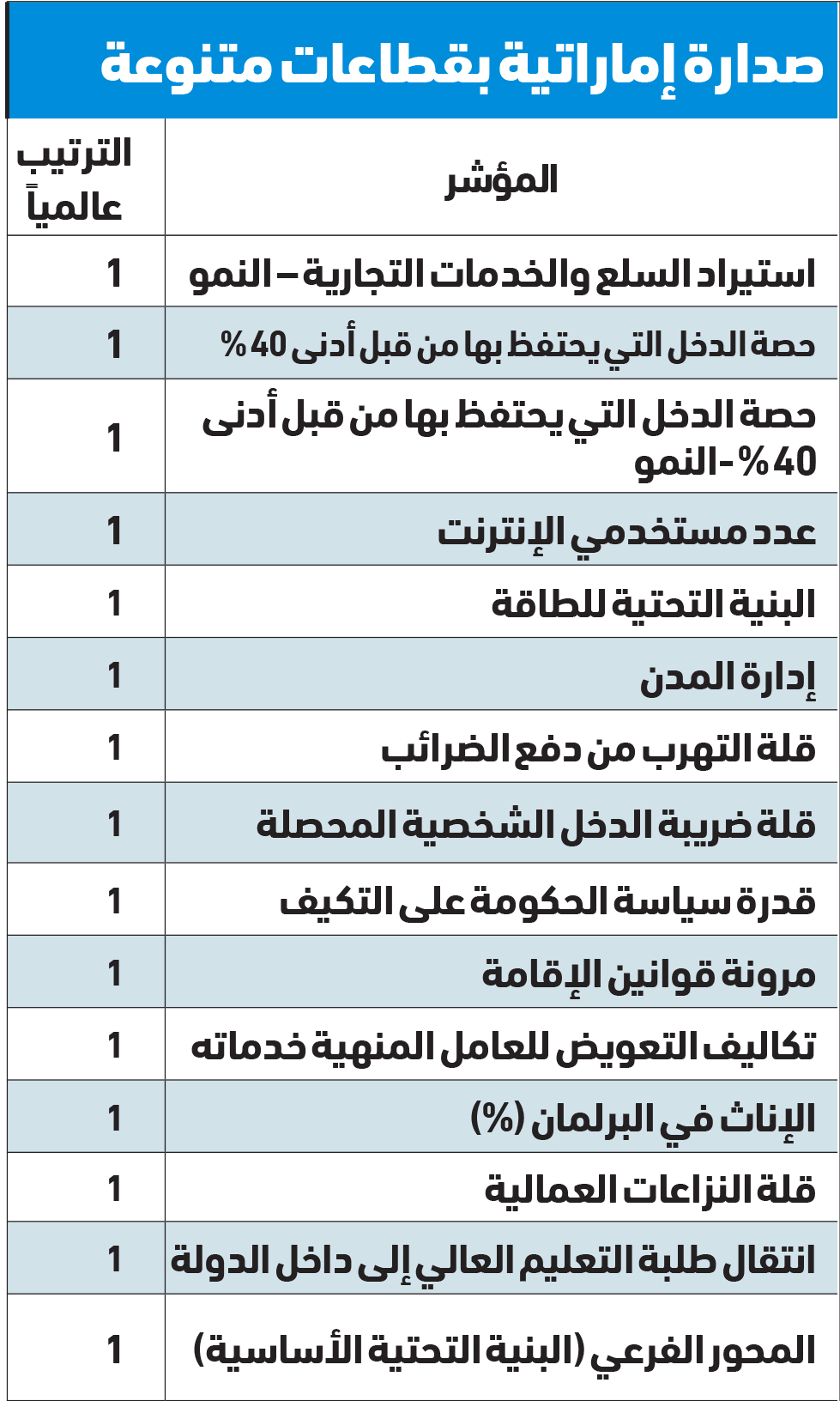 صدارة إماراتية بقطاعات متنوعةالمؤشرالترتيب عالمياًاستيراد السلع والخدمات التجارية – النمو1حصة الدخل التي يحتفظ بها من قبل أدنى 40 ٪ 1حصة الدخل التي يحتفظ بها من قبل أدنى 40 ٪ -النمو1عدد مستخدمي الإنترنت1البنية التحتية للطاقة 1إدارة المدن1قلة التهرب من دفع الضرائب1قلة ضريبة الدخل الشخصية المحصلة 1قدرة سياسة الحكومة على التكيف1مرونة قوانين الإقامة1تكاليف التعويض للعامل المنهية خدماته1الإناث في البرلمان (٪)1قلة النزاعات العمالية1انتقال طلبة التعليم العالي إلى داخل الدولة1المحور الفرعي (البنية التحتية الأساسية) 1