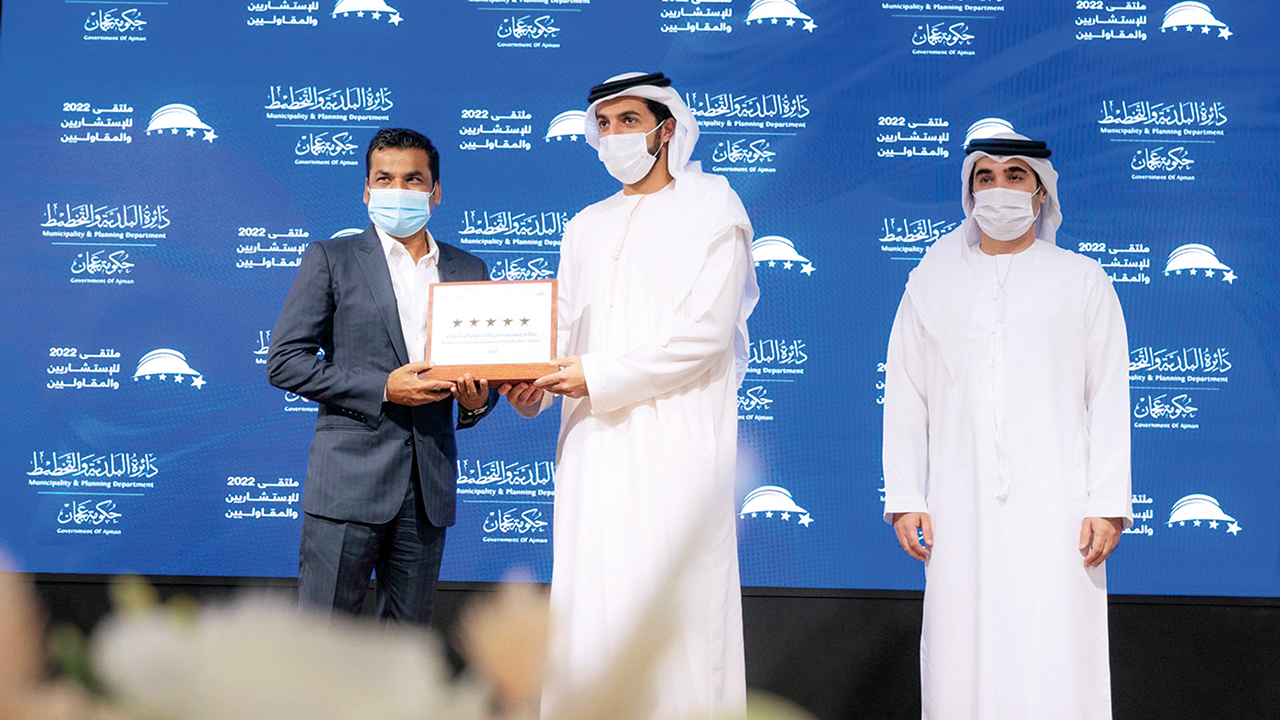 كرّم الشيخ راشد بن حميد النعيمي رئيس دائرة البلدية والتخطيط بعجمان، مكاتب الاستشارات الهندسية ومقاولات البناء العاملة وأجمل المباني في الإمارة والمستحقة للنجوم وفق نظام التصنيف العالمي.