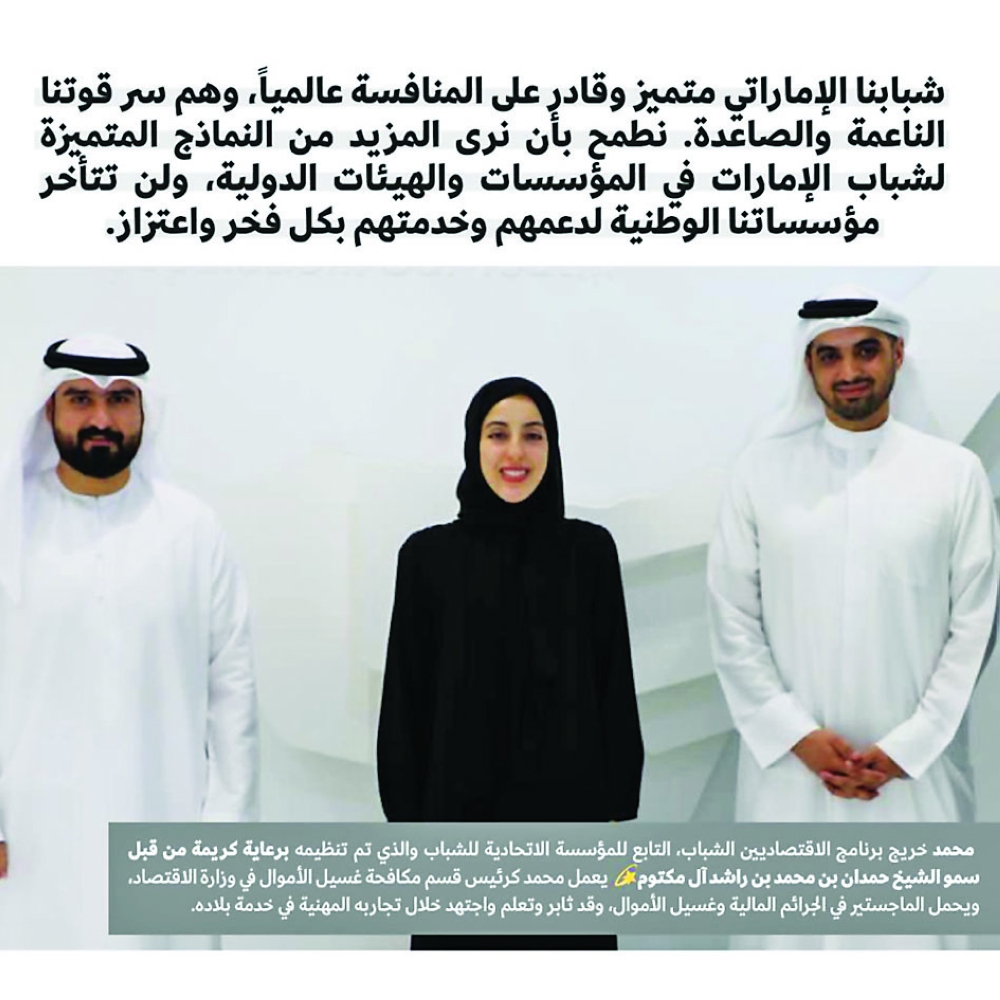 وأوضحت أن محمد هو خريج برنامج الاقتصاديين الشباب، التابع للمؤسسة الاتحادية للشباب والذي تم تنظيمه برعاية كريمة من قبل سمو الشيخ حمدان بن محمد بن راشد آل مكتوم ولي عهد دبي.