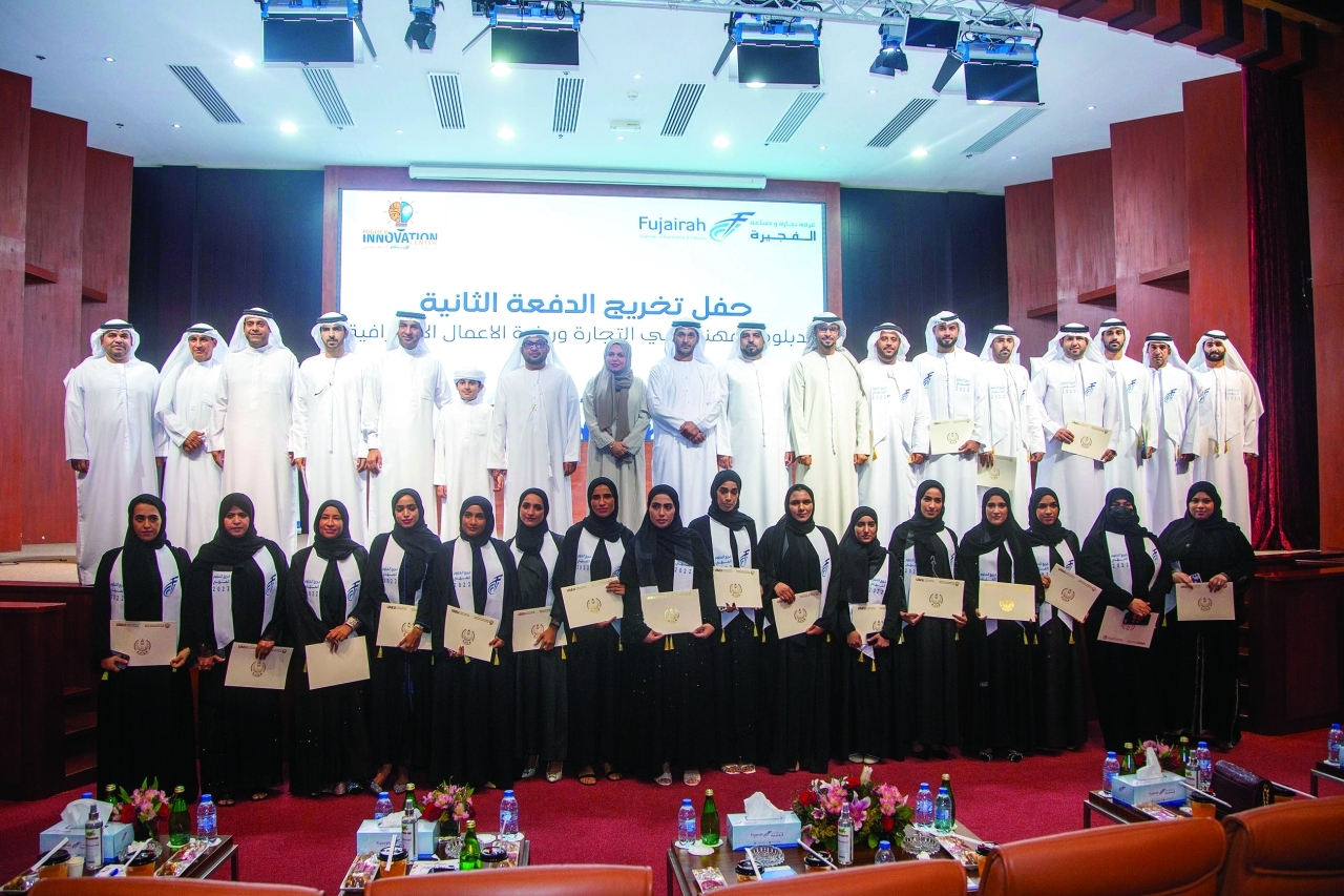 احتفلت غرفة تجارة وصناعة الفجيرة بتخريج الدفعة الثانية من منتسبي برنامج الدبلوم المهني للتجارة وريادة الأعمال الاحترافية من رائدات ورواد الأعمال، بحضور الشيخ سعيد بن سرور الشرقي، رئيس مجلس إدارة الغرفة وكل من خالد خلفان الكعبي وسلطان محمد مليح وعائشة محمد الجاسم وعبد الرحمن عبيد بن نمرود ومصبح محمد عبيد المزروعي أعضاء مجلس الإدارة وسلطان جميع الهنداسي مدير عام الغرفة.