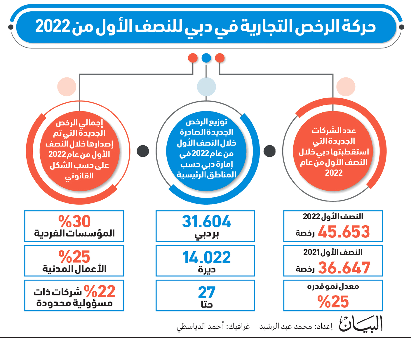 وبحسب التقرير الصادر عن قطاع التسجيل والترخيص التجاري، فقد توزّعت الرخص الجديدة التي تم إصدارها خلال النصف الأول من عام 2022 وفقاً لفئة الرخصة كالتالي: الرخص المهنية بنسبة 55%، تلتها التجارية بنسبة 45%. فيما سلّط التقرير الضوء على توزيع هذه الرخص حسب المناطق الرئيسية في إمارة دبي، وكانت الحصة الأكبر لمنطقة بر دبي بإجمالي 31.604 رخصة، ثم منطقة ديرة بمجموع 14.022 رخصة، ومنطقة حتَّا بواقع 27 رخصة جديدة، في حين جاء توزيع الرخص على حسب أعلى مناطق فرعية كالتالي: الفهيدي، برج خليفة، المرر، بور سعيد، مجمع دبي للاستثمار الأولى، نايف، القوز الثالثة، المركز التجاري الأول، البرشاء الأولى، وجبل علي الصناعية الأولى.