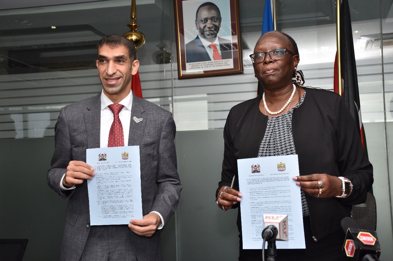 وقع معالي الدكتور ثاني بن أحمد الزيودي، وزير الدولة للتجارة الخارجية، ومعالي بيتي ماينا، وزيرة الصناعة والتجارة وتطوير المشاريع في الحكومة الكينية، اليوم إعلانا مشتركا خلال زيارة معاليه الرسمية إلى العاصمة الكينية نيروبي، يعرب البلدان الصديقان فيه عن نيتهما بدء المفاوضات نحو اتفاقية شراكة اقتصادية شاملة بين الإمارات وكينيا، وذلك بحضور سعادة الدكتور خليفة الريسي - القائم بأعمال سفارة الدولة لدى كينيا.