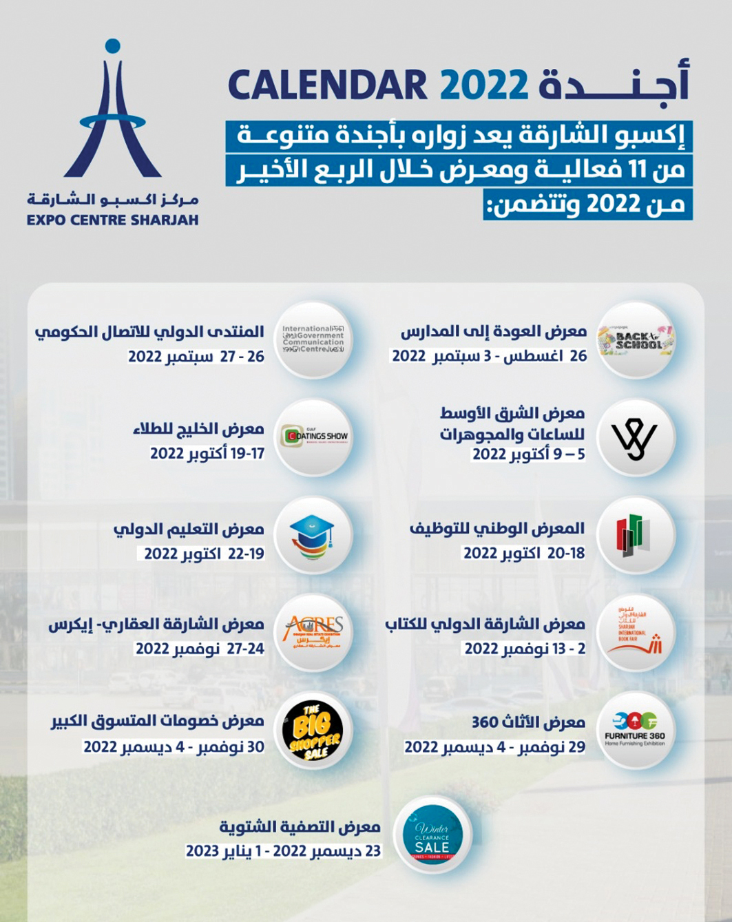 وتتضمن أبرز المعارض والأحداث التي ستنطلق أولى فعالياتها في 26 أغسطس وتختتم آخرها في الأول من يناير 2023 المقبلين، «المنتدى الدولي للاتصال الحكومي» والدورة الـ 50 من «معرض الشرق الأوسط للساعات والمجوهرات»، و«معرض الشارقة الدولي للكتاب»، و«المعرض الوطني للتوظيف» و«معرض التعليم الدولي» ومعرض الشارقة العقاري (إيكرس)، إلى جانب النسخة الأولى من معرض الخليج للطلاء والعديد من معارض قطاع التجزئة والفعاليات الثقافية والاجتماعية.