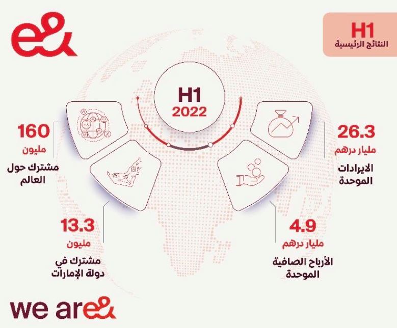 أعلنت مجموعة "&e" المعروفة سابقًا باسم "مجموعة اتصالات" اليوم عن نتائجها المالية الموحدة للنصف الأول من العام 2022، حيث حققت صافي أرباح بنحو 4.9 مليارات درهم بنمو بنسبة 2.5% مقارنة بالفترة نفسها من العام الماضي 2021.