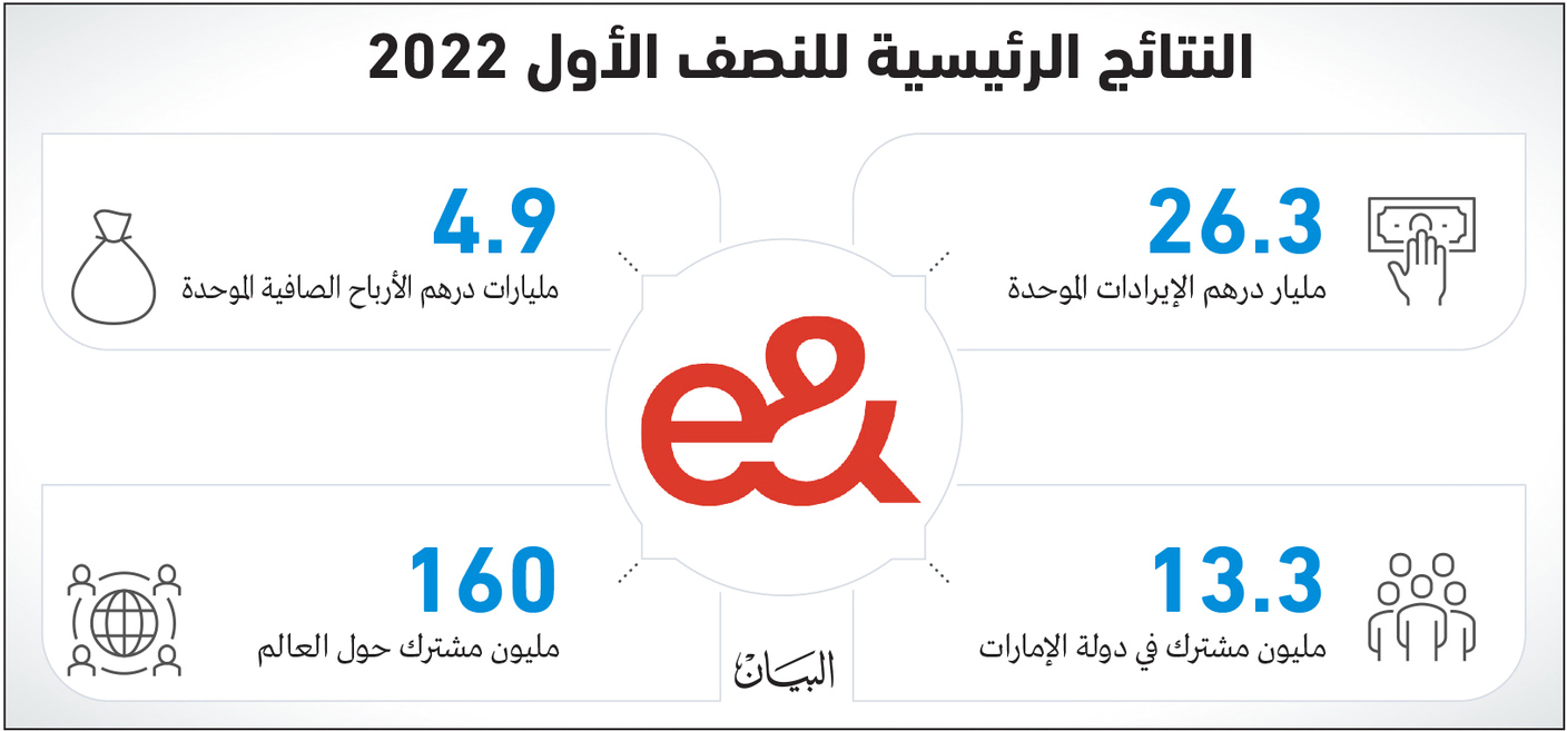 أعلنت &e (المعروفة سابقاً باسم «مجموعة اتصالات» نتائجها المالية الموحدة للنصف الأول وبلغت قيمة الإيرادات الموحدة 26.3 مليار درهم وبلغت أرباحها الصافية الموحدة 4.9 مليارات درهم، بزيادة سنوية 2.5% ووفقاً لأسعار الصرف الثابتة، زادت الإيرادات 3.8%، فيما بلغت أرباح &e قبل احتساب الفائدة والضريبة والاستهلاك والإطفاء 13.4 مليار درهم، وارتفعت 4.1% وفقاً لأسعار الصرف الثابتة، مما أدى إلى هامش أرباح قبل احتساب الفائدة والضريبة والاستهلاك والإطفاء 51 %، واعتمد مجلس الإدارة توزيع أرباح نقدية على المساهمين للنصف الأول بقيمة 40 فلساً للسهم.