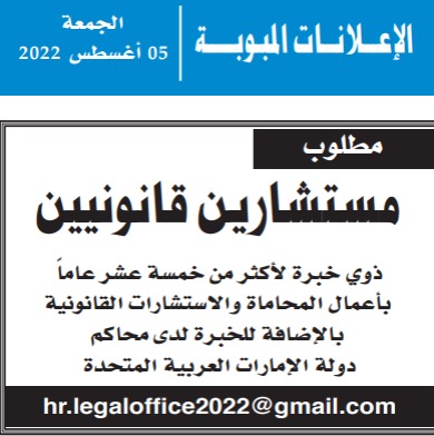 مطلوب مستشارين قانونيين في الإمارات مطلوب مستشارين قانونيين ذوي خبرة لأكثر من خمسة عشر عاماً بأعمال المحاماة والاستشارات القانونية بالإضافة للخبرة لدى محاكم دولة الإمارات العربية المتحدة.