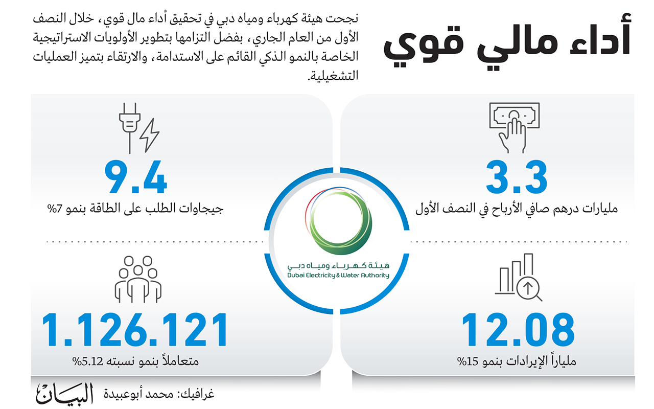 حققت هيئة كهرباء ومياه دبي «ديوا» 12.08 مليار درهم إيرادات عن النصف الأول من العام الجاري بنمو نسبته 15% مدفوعة بشكل رئيسي بارتفاع الطلب، فيما وصل صافي الأرباح إلى 3.30 مليارات درهم بنمو سنوي 33%. أما إيرادات الربع الثاني فقد بلغت 7.01 مليارات درهم، فيما سجل صافي الأرباح في نفس الربع 2.61 مليار درهم.