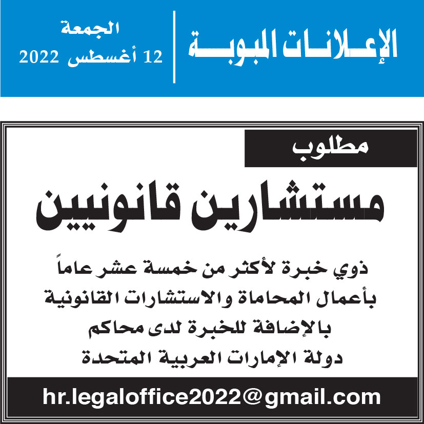 مطلوب مستشارين قانونيين ذوي خبرة في محاكم الإمارات مطلوب مستشارين قانونيين ذوي خبرة لأكثر من خمسة عشر عاماً بأعمال المحاماة والاستشارات القانونية بالإضافة للخبرة لدى محاكم دولة الإمارات العربية المتحدة.