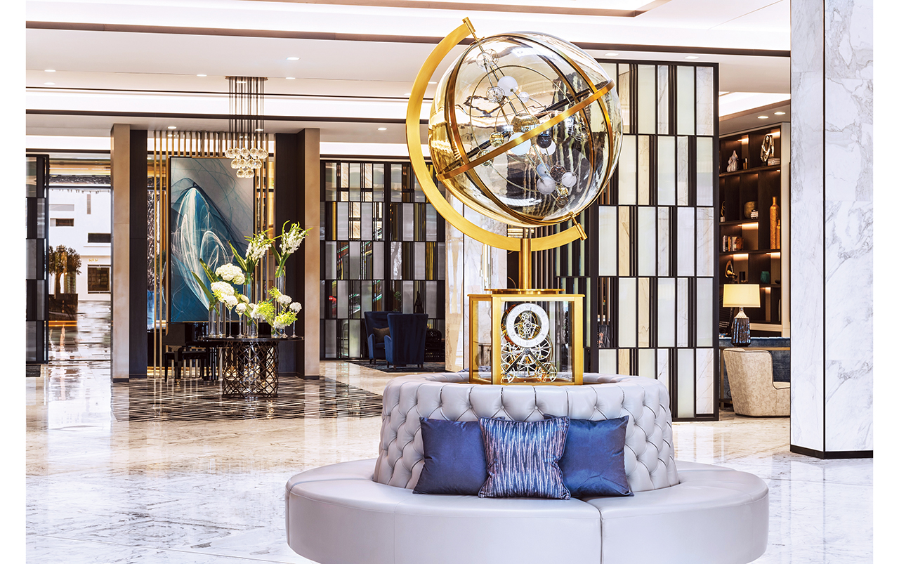 فبدءاً من التحف الفنّية المستوحاة من إرث الكويت العريق، مروراً بالمنسوجات مخمليّة الملمس واللمسات الرخاميّة ودرجات الألوان الفاخرة من البيج والذهبي والفضي، وصولاً إلى السلالم المنحوتة التي تُشكّل المعلم الأبرز في الردهة، تمّ انتقاء كلّ تفصيل بدقّة بالغة ليشعر الضيوف فور وصولهم بأقصى درجات الراحة تماماً كما ولو كانوا في كنف منزلهم.