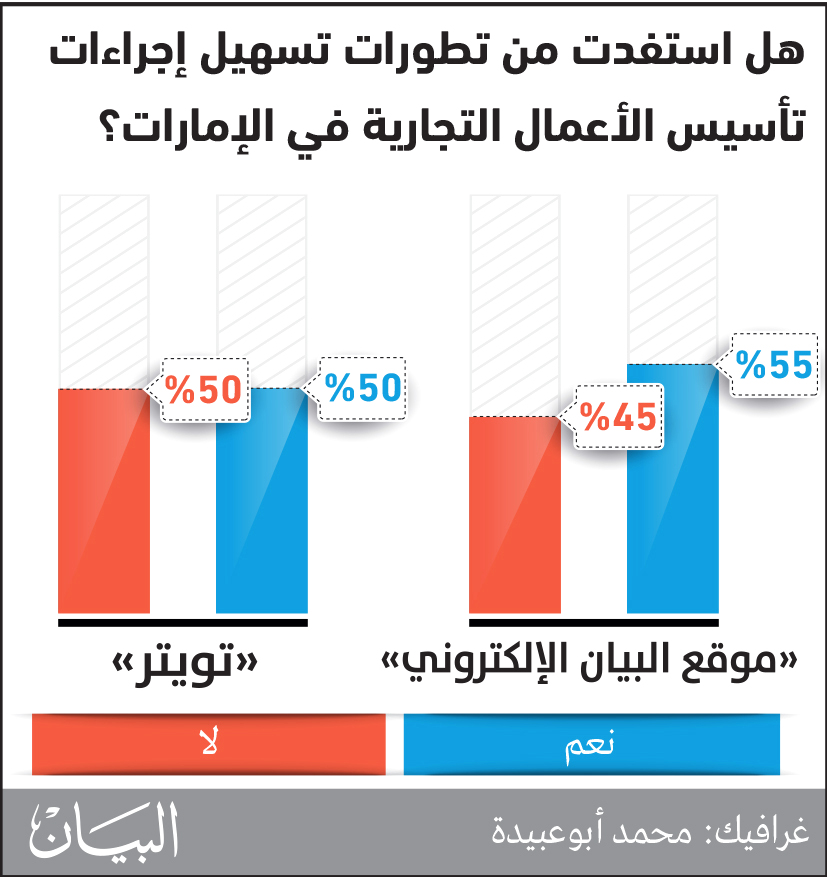 ورداً على سؤال: «هل استفدت من تطورات تسهيل إجراءات تأسيس الأعمال التجارية في الإمارات؟»، قال 55 % من المستطلعة آراؤهم على موقع «البيان الإلكتروني» إنهم استفادوا منها. وبالنسبة لموقع «تويتر» أكد 50 % استفادتهم من إجراءات تأسيس الأعمال التجارية في الدولة.