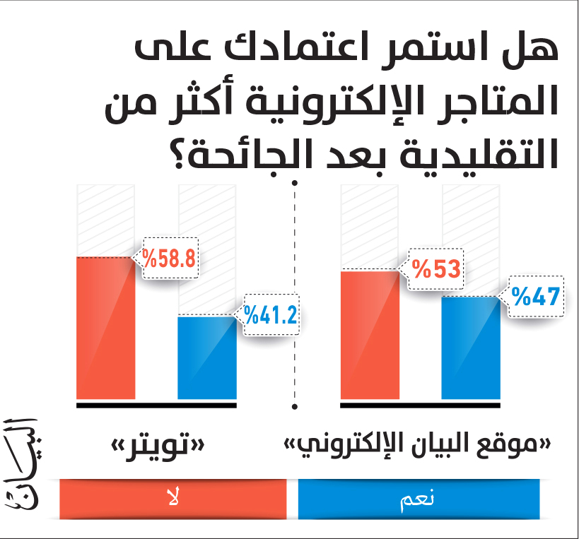 ورداً على سؤال: «هل استمر اعتمادك على المتاجر الإلكترونية أكثر من التقليدية بعد الجائحة؟»، أجاب 53 % من المشاركين في الاستطلاع على موقع «البيان» الإلكتروني بلا، فيما أعرب 47 % عن تزايد اعتمادهم على المتاجر الرقمية. وجاءت النتيجة مشابهة في الاستطلاع على «تويتر»، حيث أكد 58.8 % من المشاركين عدم استمرار نمو إقبالهم على المتاجر الإلكترونية مقابل 41.2 % ممكن أجابوا بنعم.