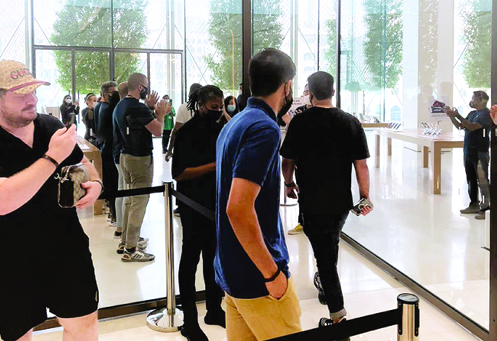 تجمعت أعداد كبيرة من المشترين أمام متاجر «أبل» في دبي وأبوظبي وفي بلدان أخرى مثل أستراليا واليابان والهند منذ ساعات الصباح الأولى أمس للمسارعة في الحصول على أحدث ابتكارات عملاق التقنية الأمريكي من هواتف آيفون 14 الجديدة.